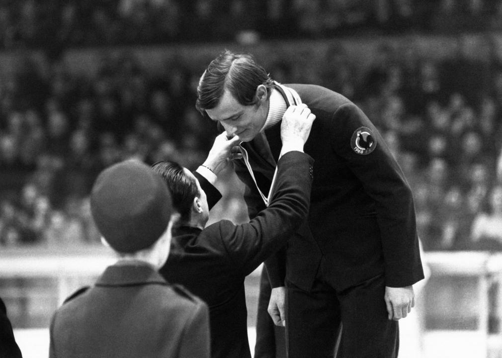 Killy, then 24, won the downhill by .08 seconds despite accidentally stripping his skis of wax on a practice run, and he handily won the giant slalom. The slalom, his third event, was held in thick fog and Austria’s Karl Schranz, who had the fastest time, was disqualified by a race jury for missing gates before a soldier interfered.