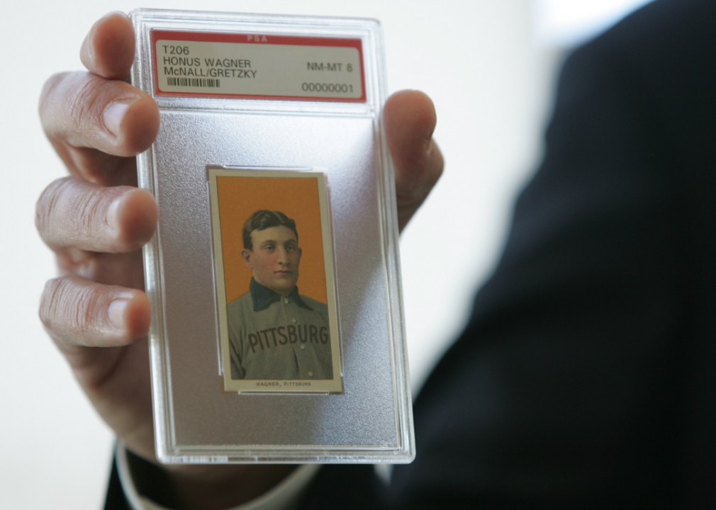 The famous 1909 Honus Wagner baseball card encased in plastic