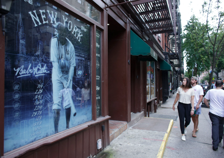 People pass by Bleecker Trading in New York on July 06, 2021 looking at a black and white image of Babe Ruth covering the window.