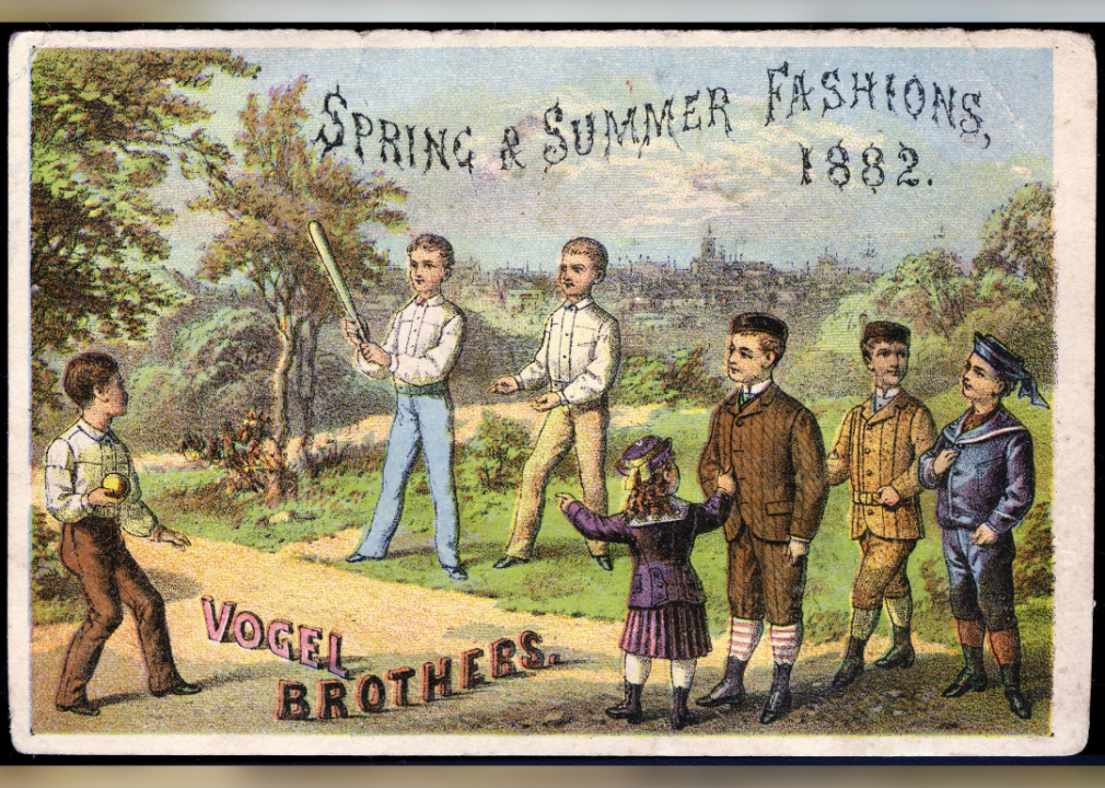 Baseball lithographed trade card to promote clothiers showing kids dressed nicely, playing and watching baseball.