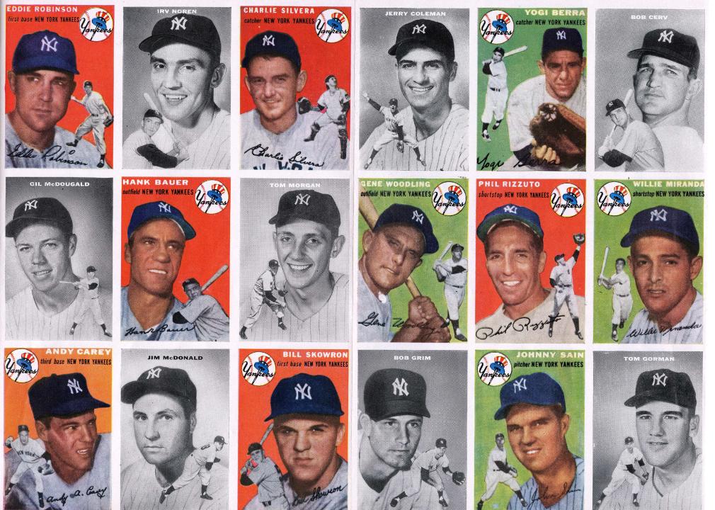 Folded poster insert, from Topps Chewing Gum, features baseball cards that highlight members of the 1954 New York Yankees, New York, New York, August 23, 1954.