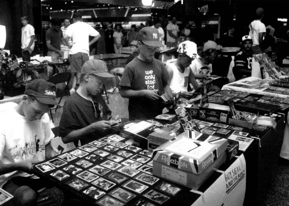Kids at their tables loaded with many cards to trade and sell at a baseball card show.