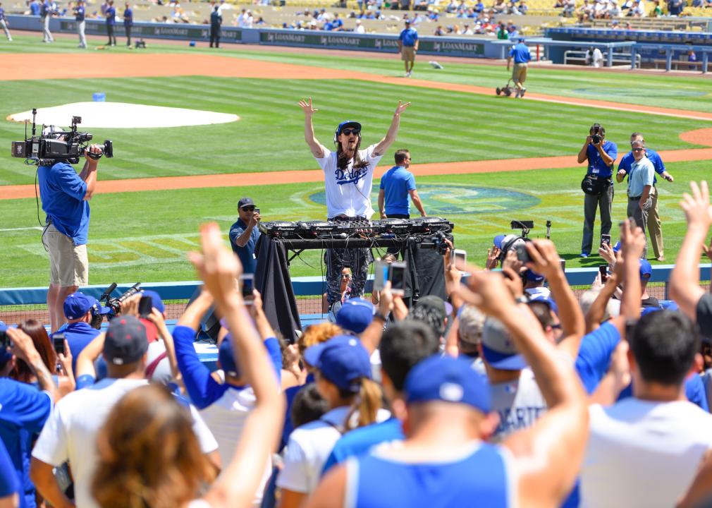 Steve Aoki deejays before a baseball game between the Colorado Rockies and the Los Angeles Dodgers at Dodger Stadium on April 19, 2015 in Los Angeles, California.