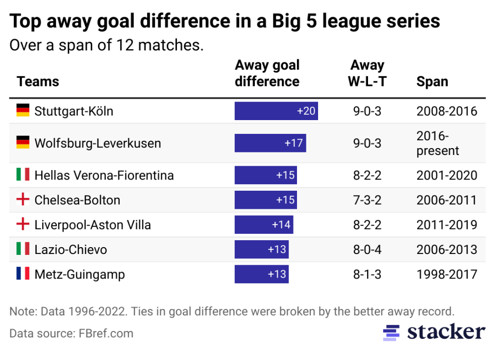 Just one qualifying European series between VfB Stuttgart and 1. FC Köln (Cologne) has seen a better away goal difference over 12 matches with plus-20 goals. When expanding past a 12-match span, the away supremacy of the Stuttgart-FC Köln series in Germany’s Bundesliga has been truly staggering. In October 2000, FC Köln beat Stuttgart 3-2 at home. It took the series 17 years and 20 matches later for a home team to win again in Bundesliga play—Stuttgart won 2-1 in October 2017 to end the home win drought. During the 19 matches between the home victories, the away team won 11 times with eight draws.