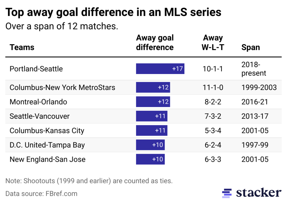 Stacker analyzed all 6,925 MLS regular season matches that occurred in history from 1996 through Aug. 6, 2022. Out of the 188 matchups that have been played at least 12 times, the Timbers-Sounders series is the only one where the away team has had a 12-game span with an away goal difference above plus-1 goals per game. The series’ 17-goal margin translates to a goal difference of plus-1.42 per match.