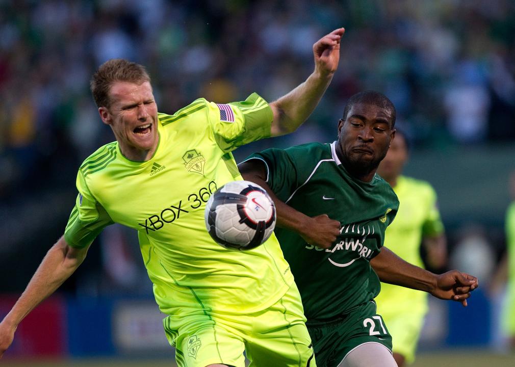 Taylor Graham of Seattle Sounders battles Bright Dike of the Portland Timbers during the Lamar Hunt U.S Open Cup in 2010