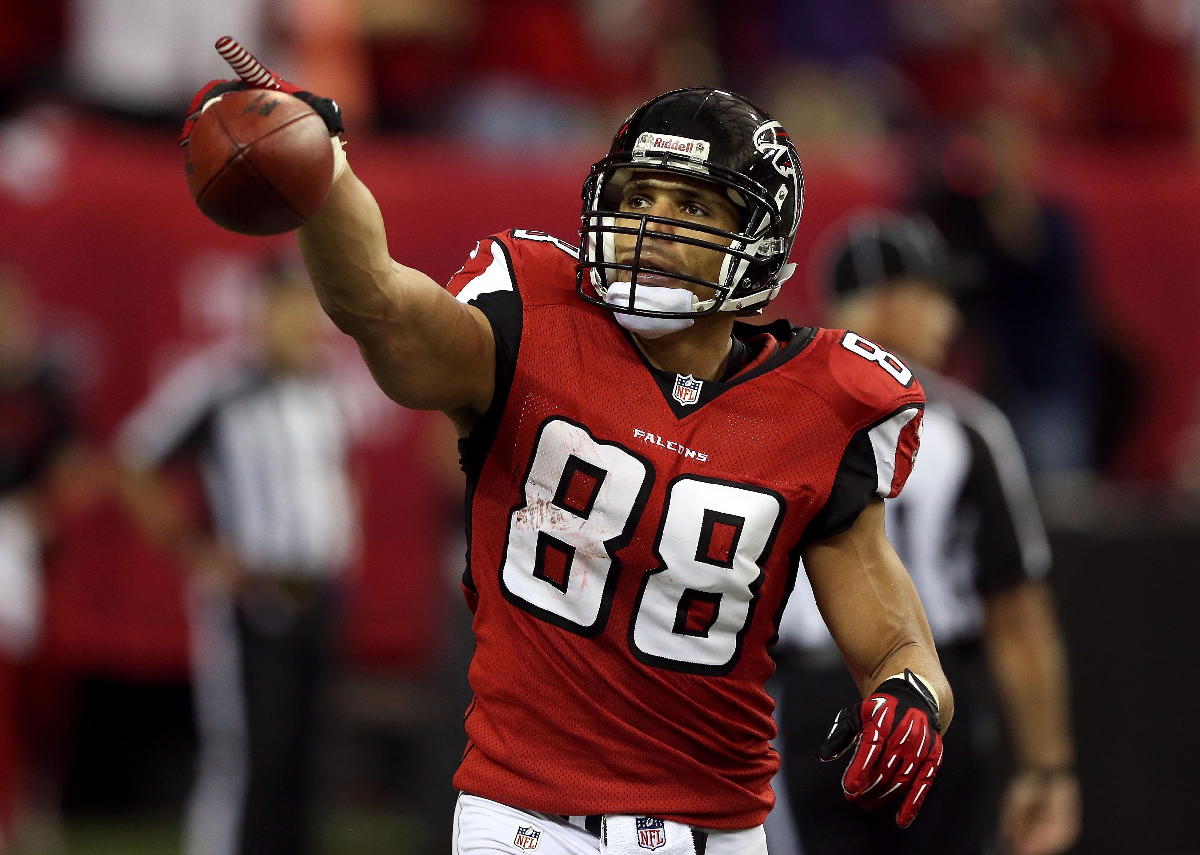 Tony Gonzalez of the Atlanta Falcons celebrates after catching a touchdown