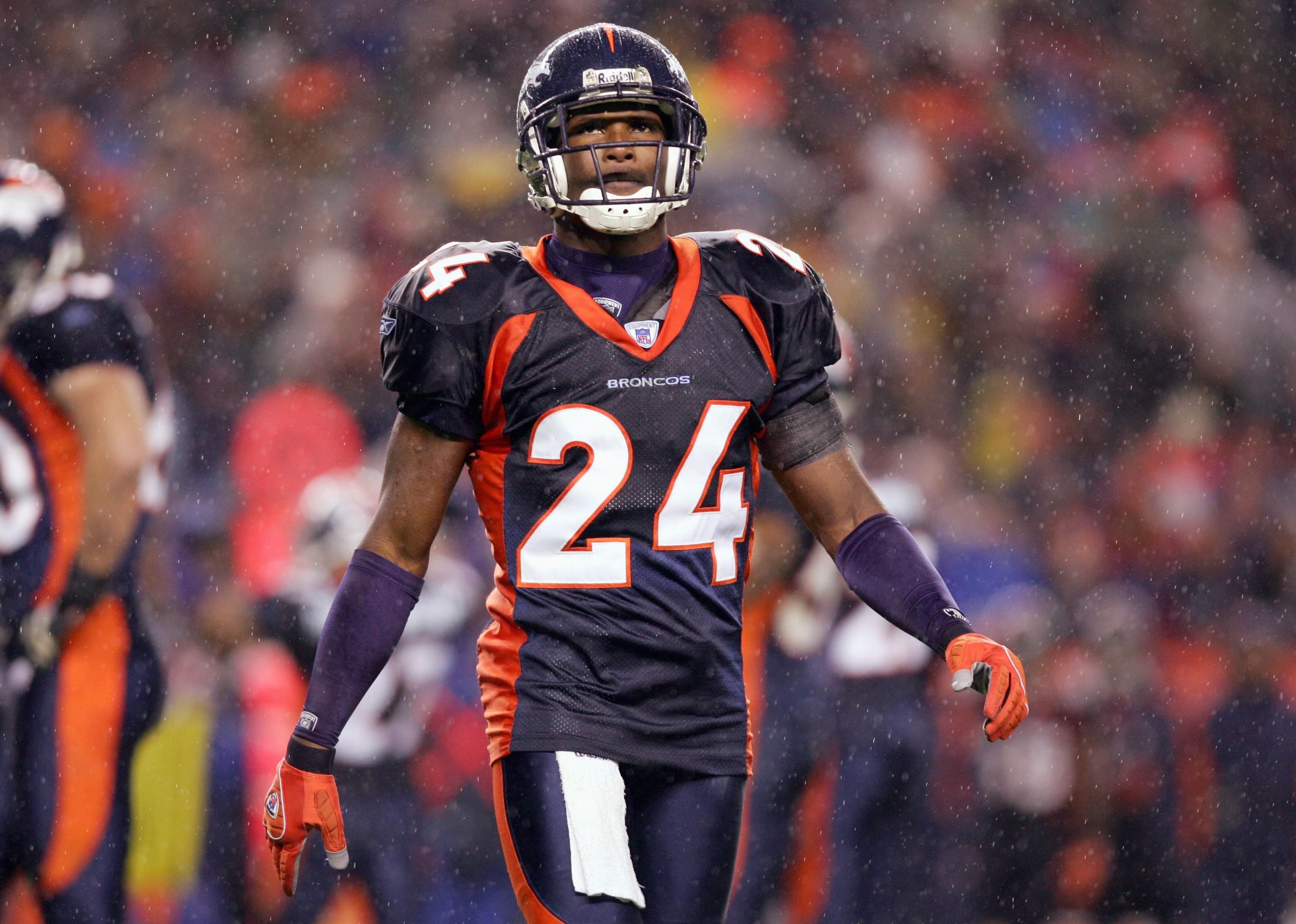 Champ Bailey of the Denver Broncos walks on the field