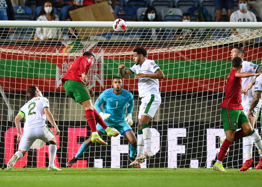 Cristiano Ronaldo of Portugal heads to score his side’s second goal during the FIFA World Cup 2022 qualifying group