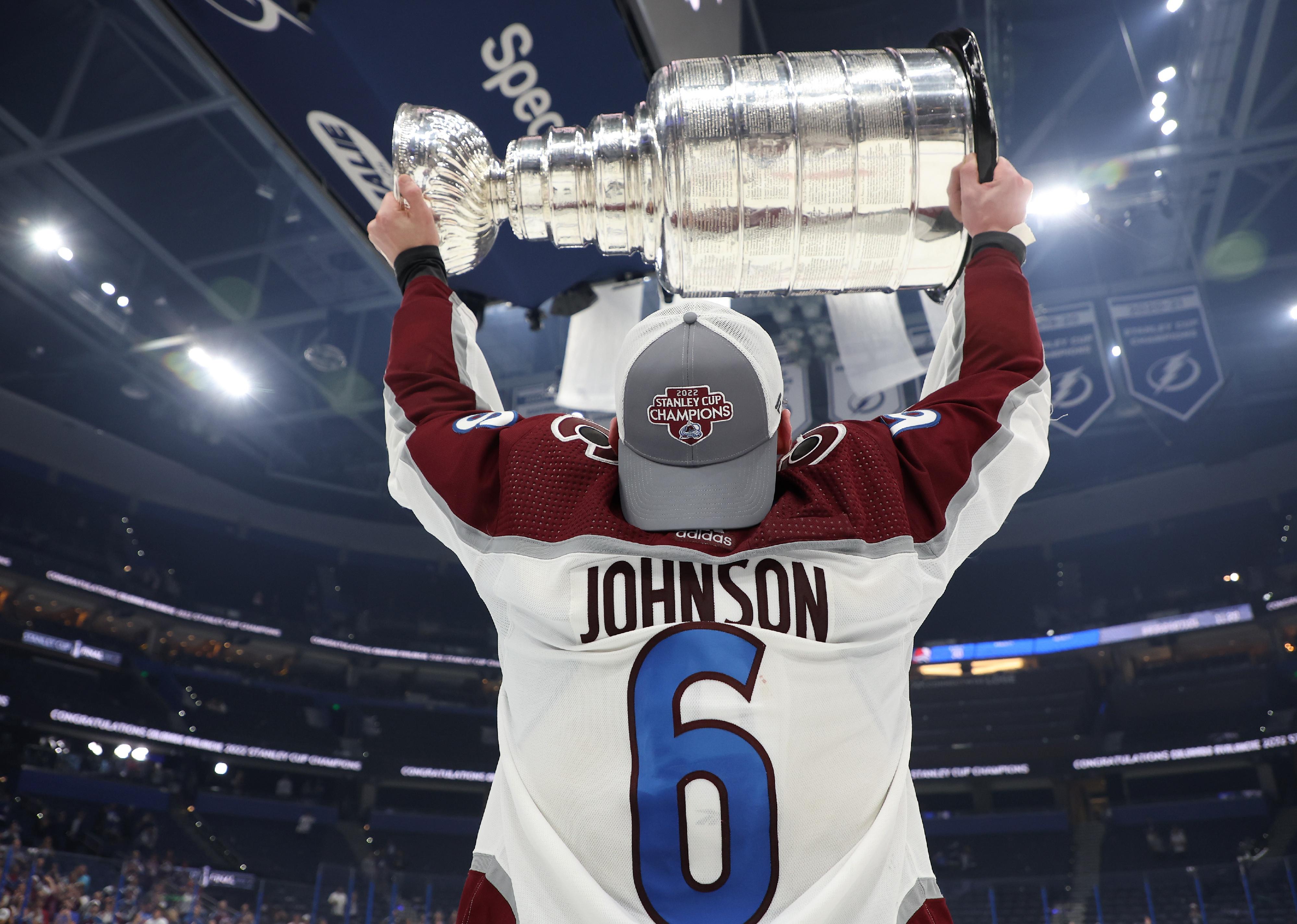 Erik Johnson of the Colorado Avalanche lifts the Stanley Cup