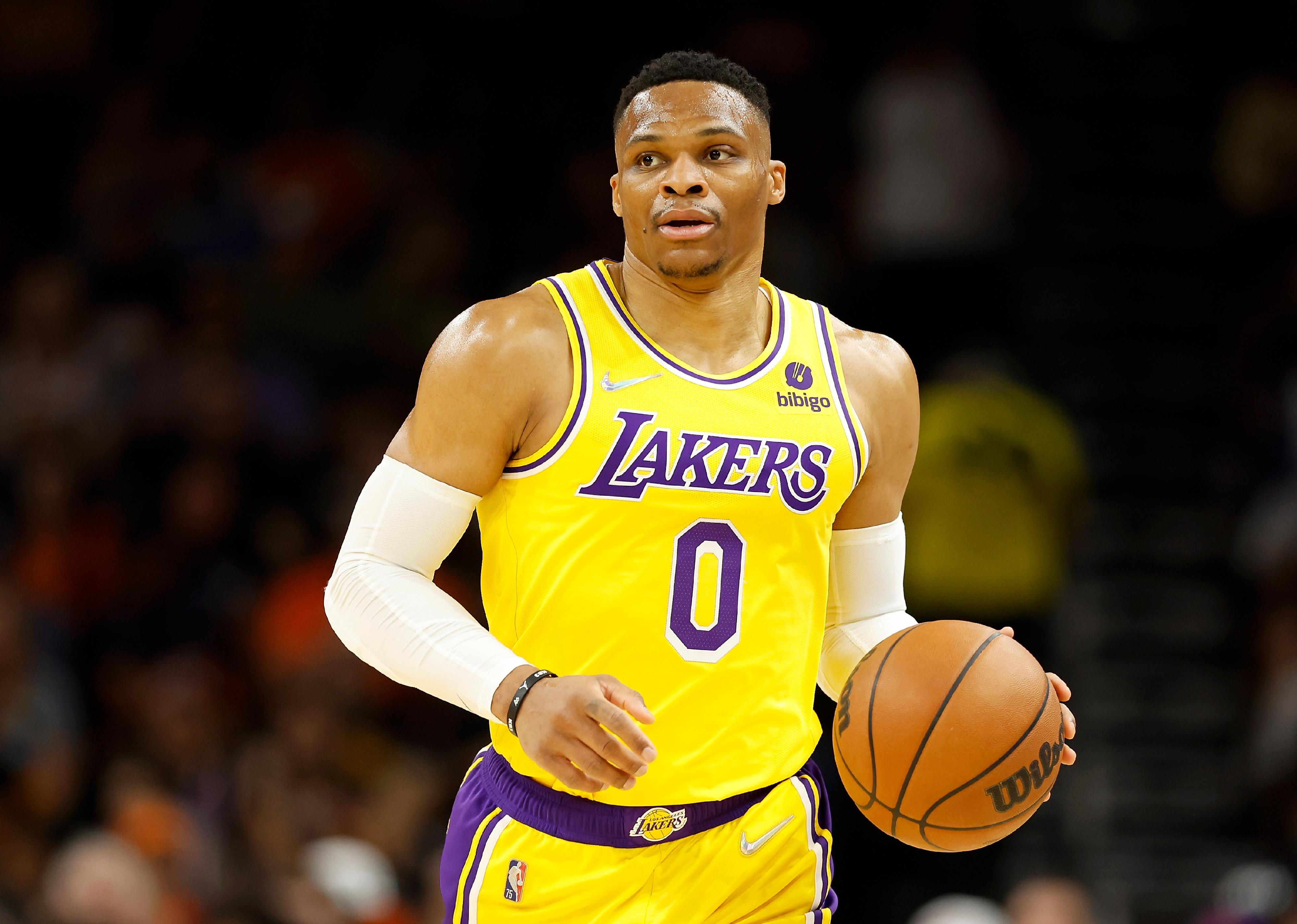Russell Westbrook of the Los Angeles Lakers handles the ball