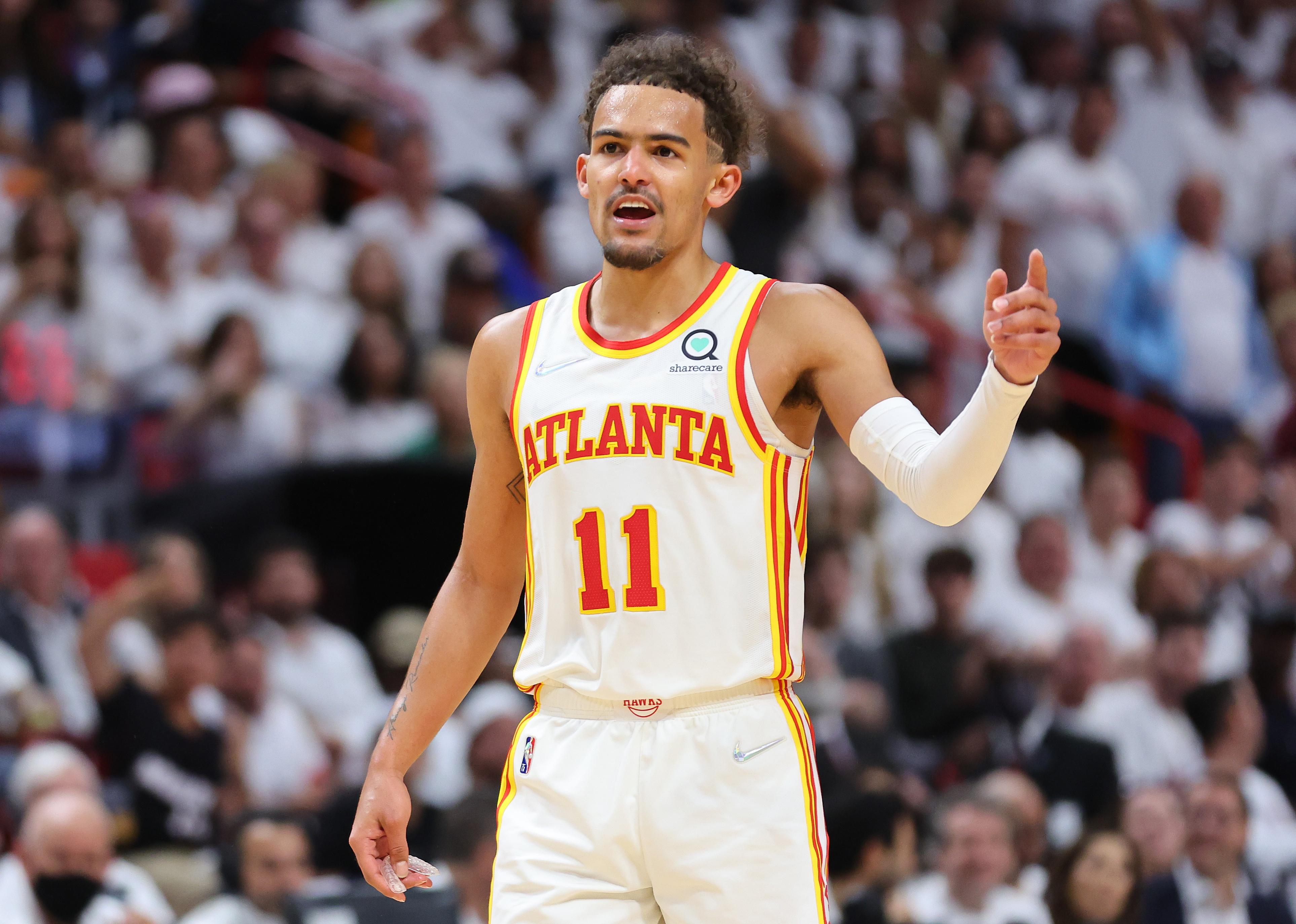 Trae Young of the Atlanta Hawks reacts against the Miami Heat