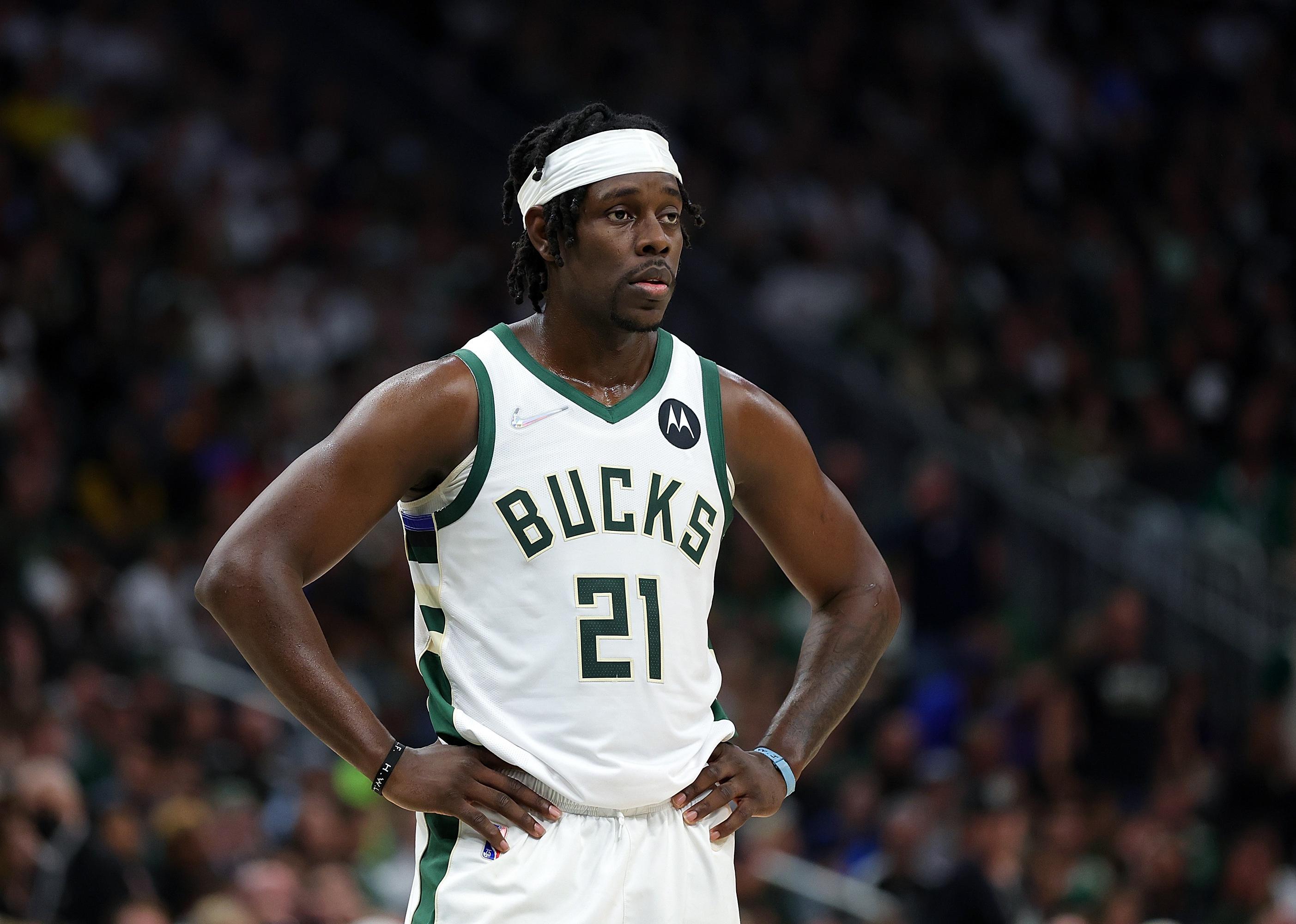 Jrue Holiday of the Milwaukee Bucks looks to the bench