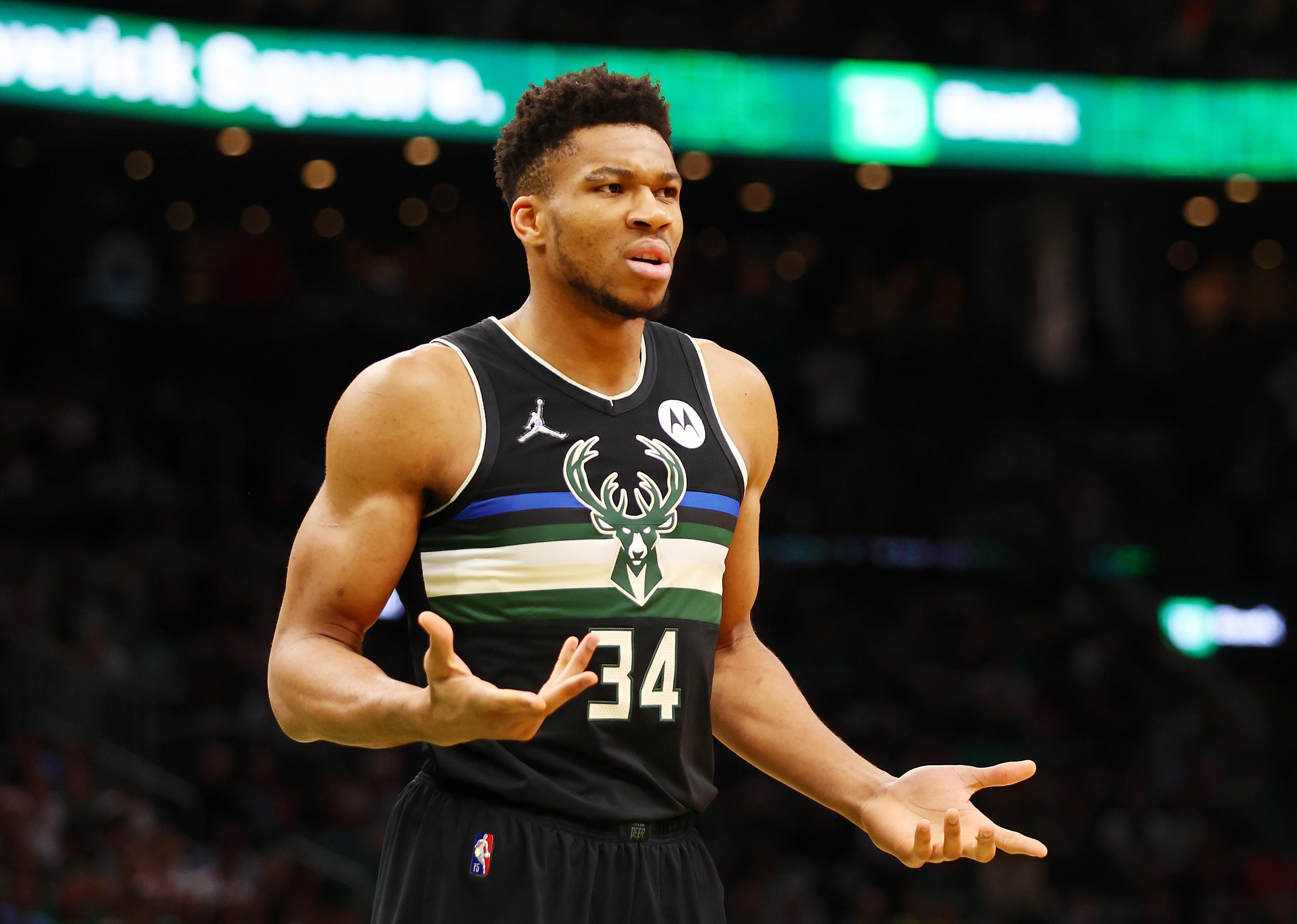 Giannis Antetokounmpo of the Milwaukee Bucks reacts during a game