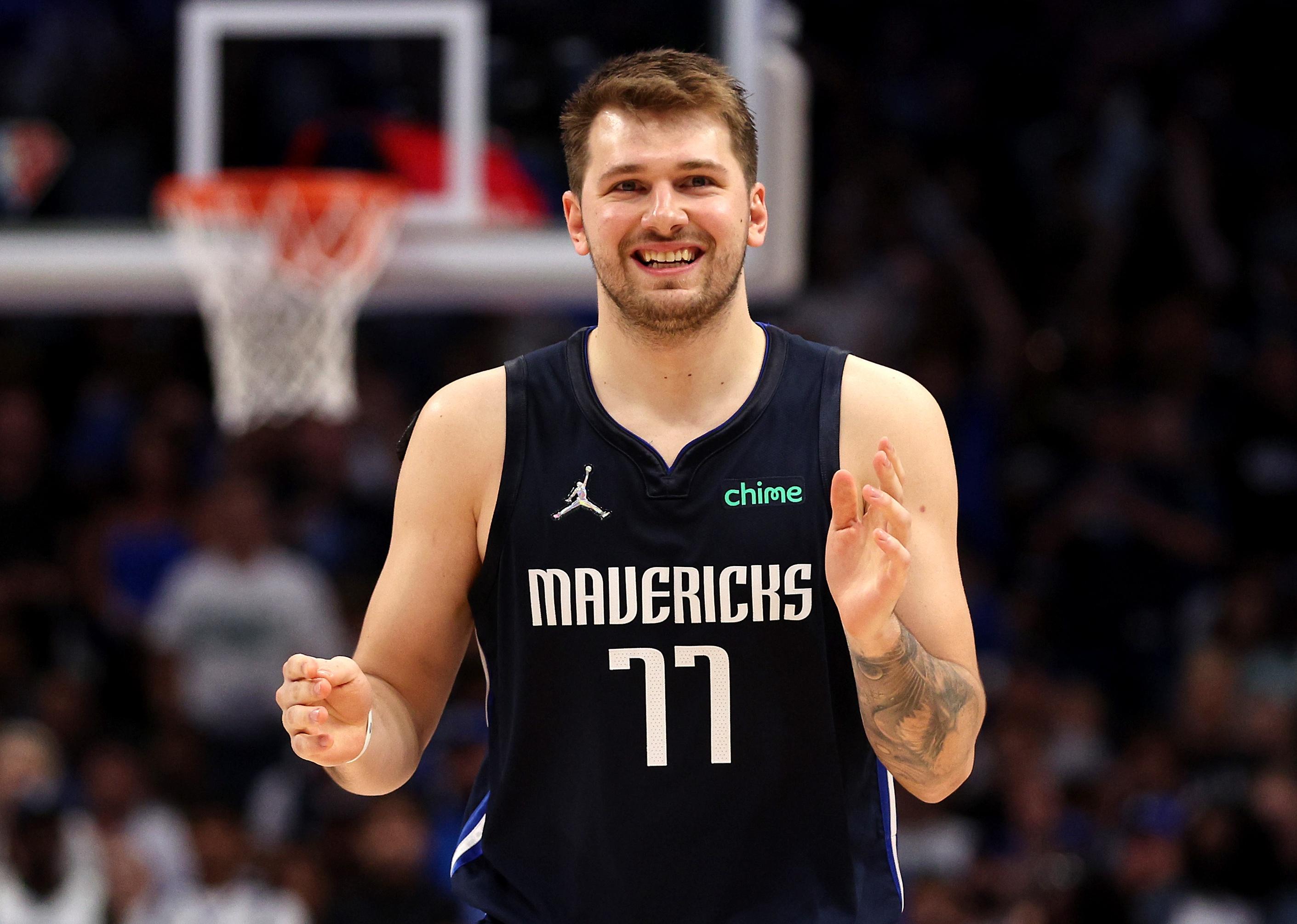 Luka Doncic of the Dallas Mavericks reacts to a play