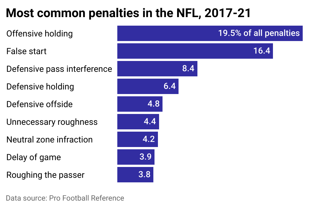 The other penalty call that fans are most likely to hear, accounting for nearly one in six penalties, is an offensive false start (2.1 times per game). All sorts of gamesmanship take place between opposing linemen as they try to draw each other off the line early—and home-crowd fan noise often comes into play as well.
