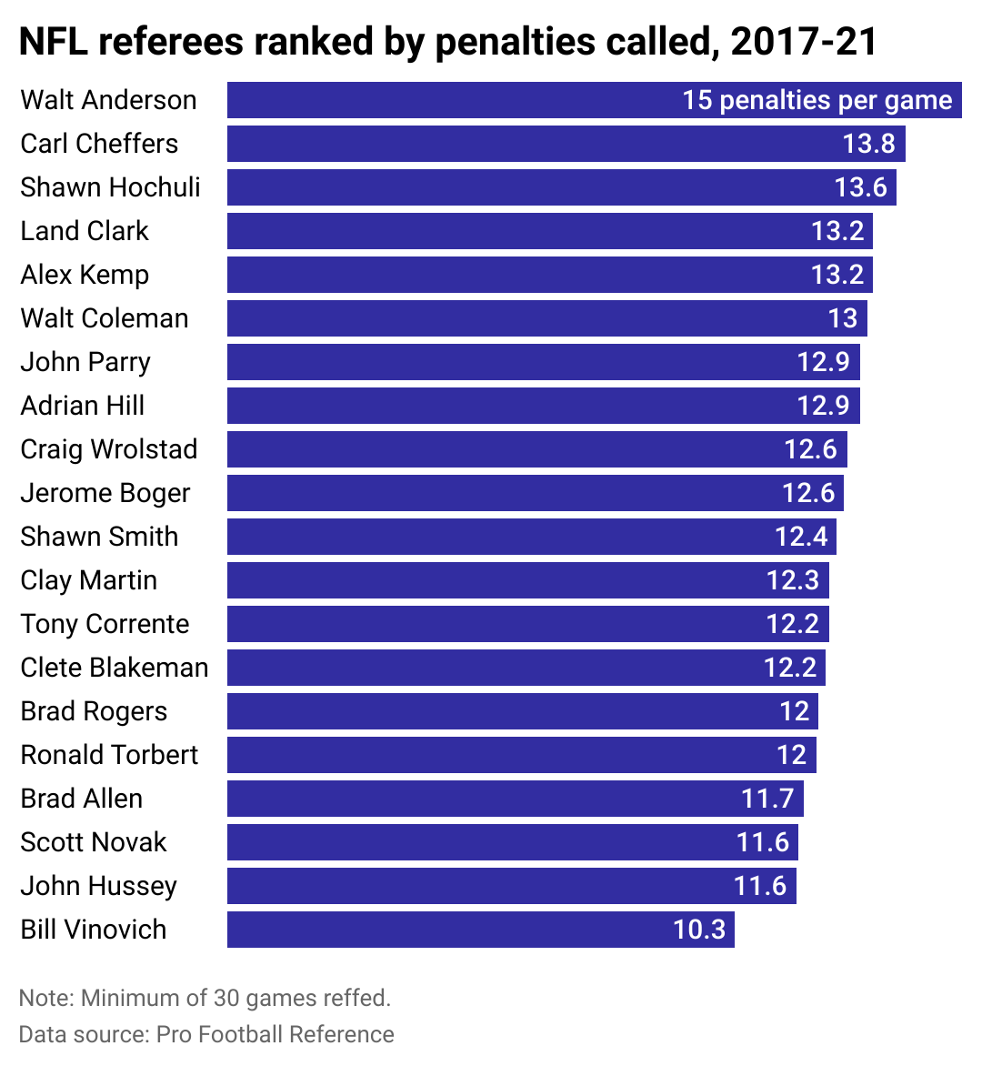 Bar chart of the NFL officials who call the most penalties per game 2017-21.