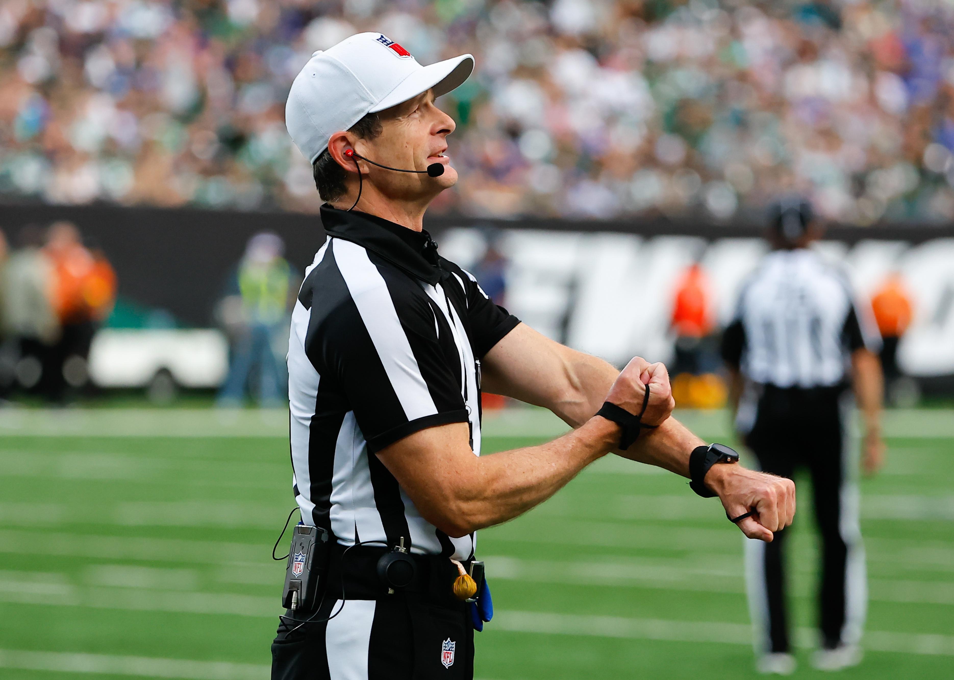 Referee Land Clark calls a penalty during a game between the New York Jets and Buffalo Bills.