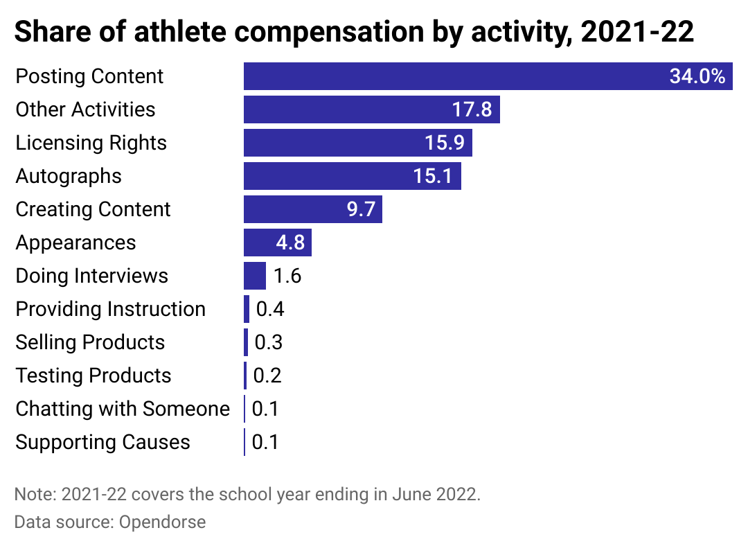 Posting on social media is by far the activity that earns the most money—over one-third of all compensation during the first year of NIL deals was for posting content over social channels. It’s not surprising: With built-in follower counts and easy audience engagement, social media provides an efficient avenue for gauging the success—or potential success—of partnering with a student-athlete.