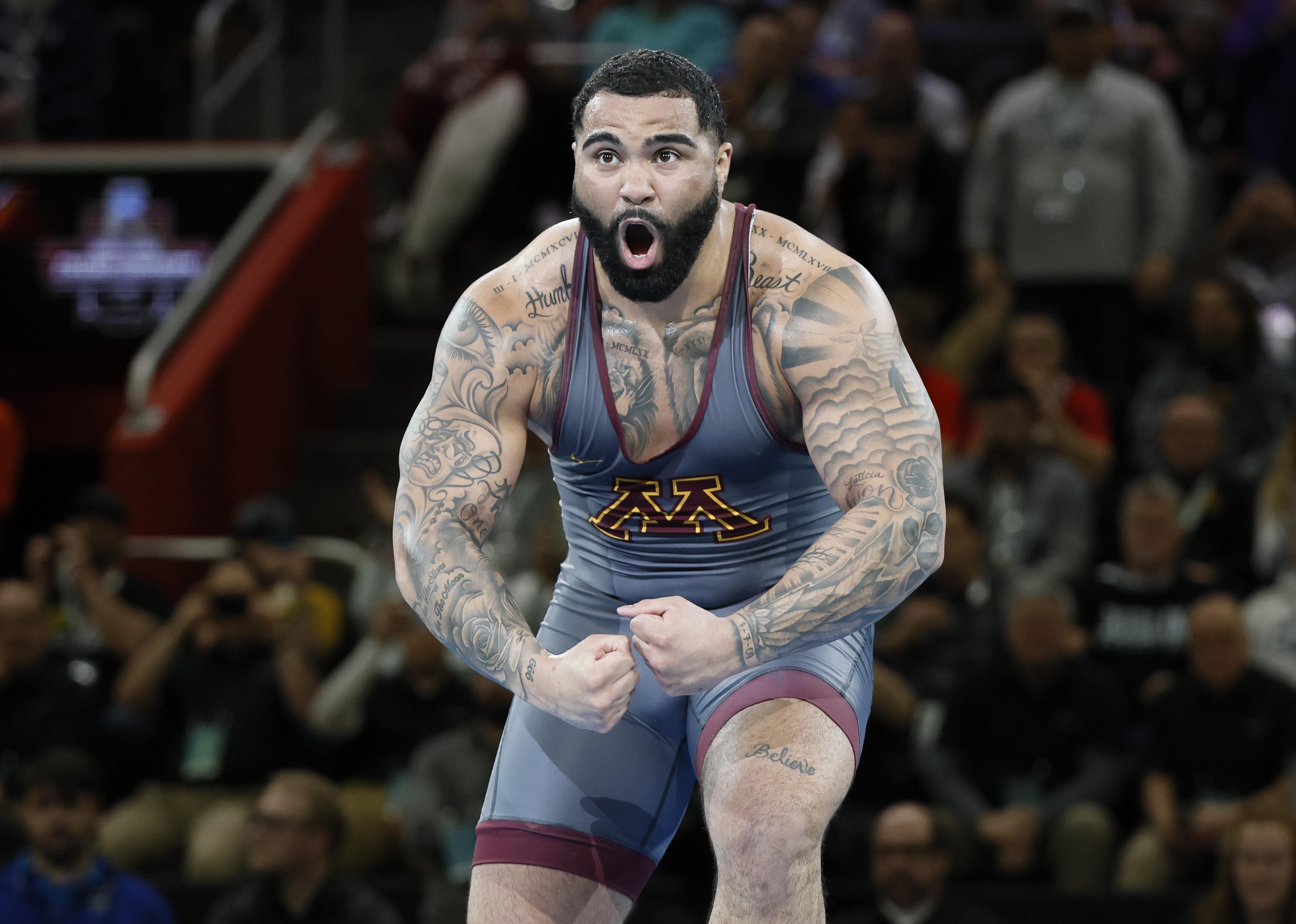 Gable Steveson of the Minnesota Golden Gophers celebrates a win.