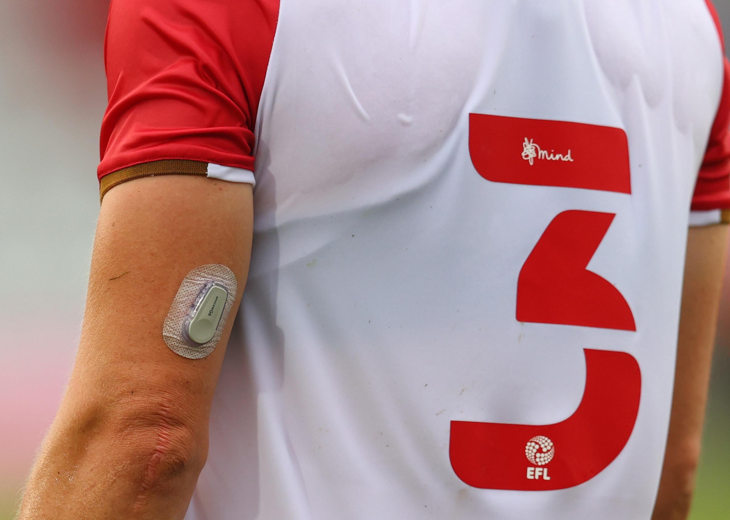 Detailed view of a player with a Dexcom g6 glucose monitoring system.