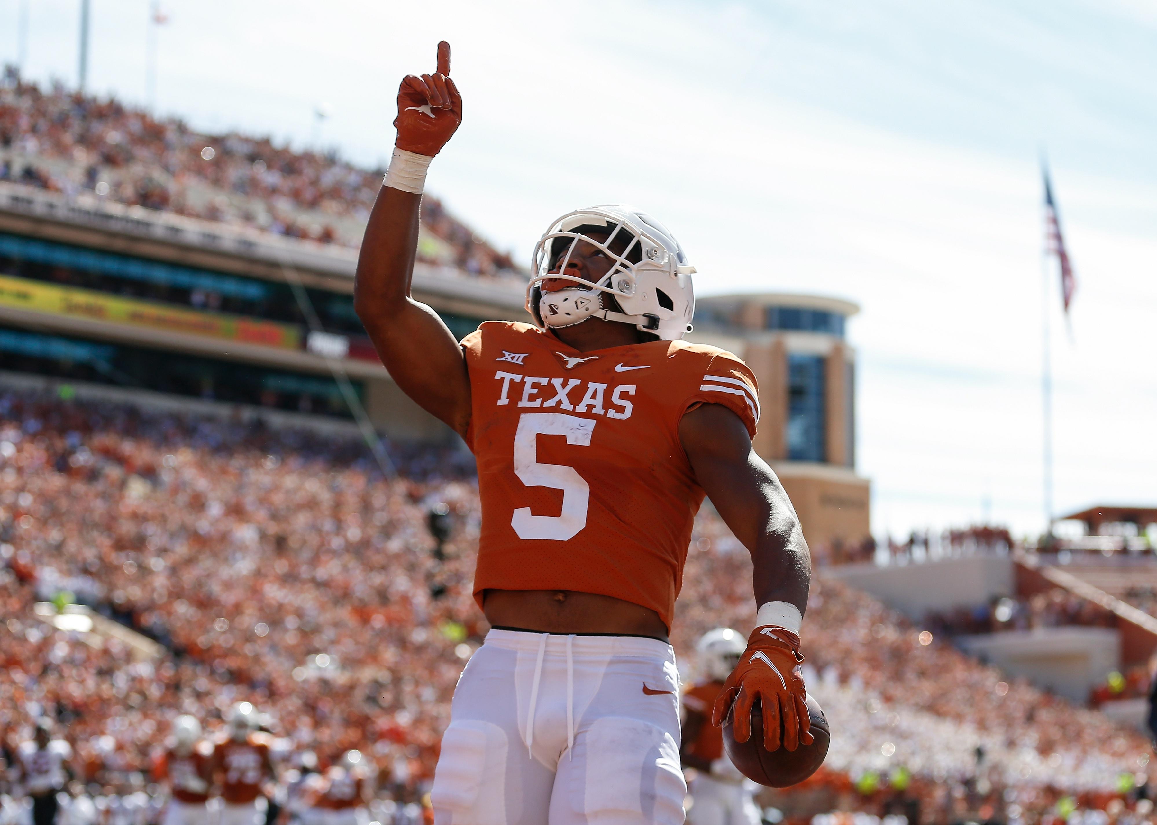 Bijan Robinson of the Texas Longhorns reacts after a touchdown.