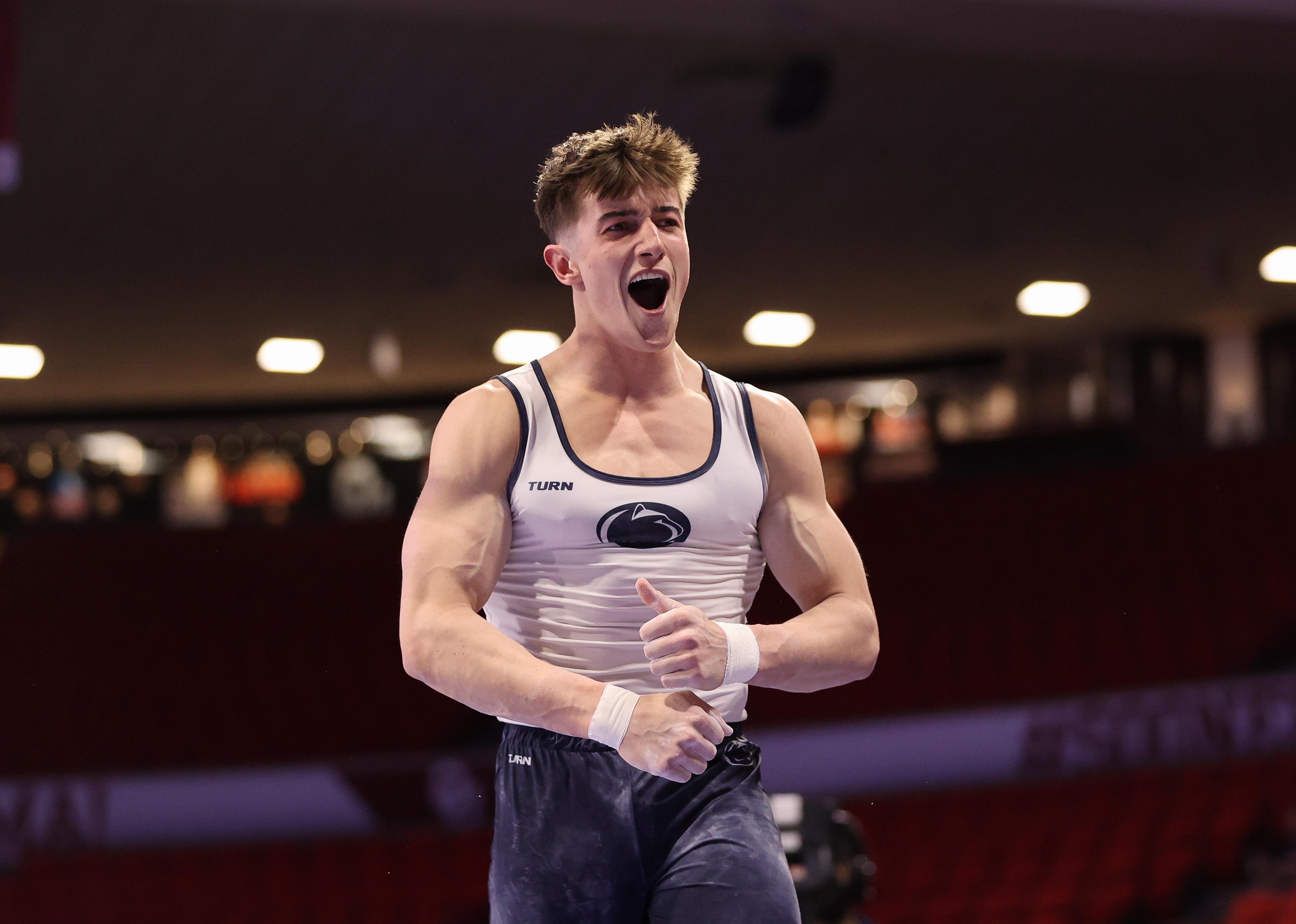 Michael Jaroh of Penn State reacts after competing in parallel bars.