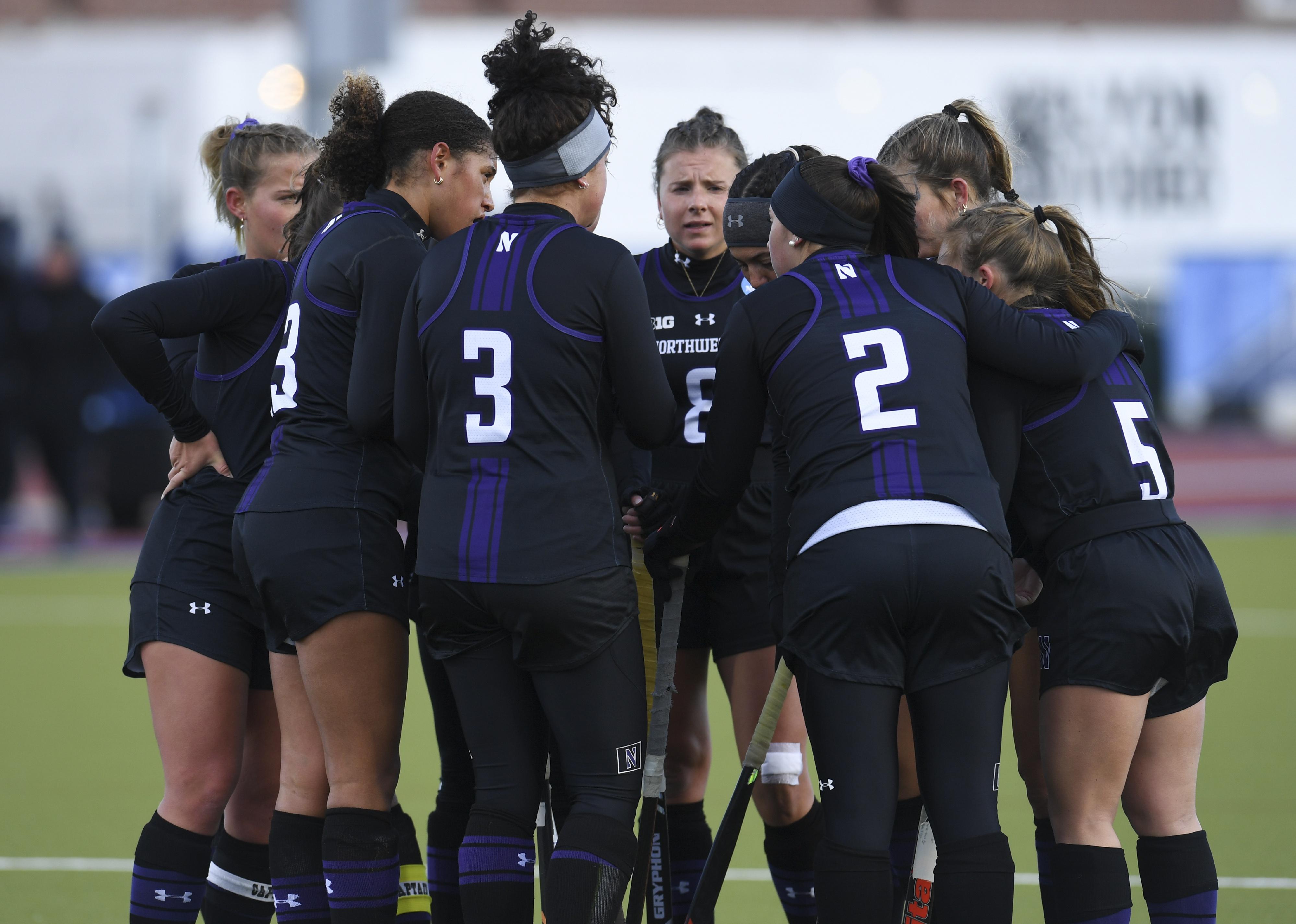 The Northwestern Wildcats huddle together.