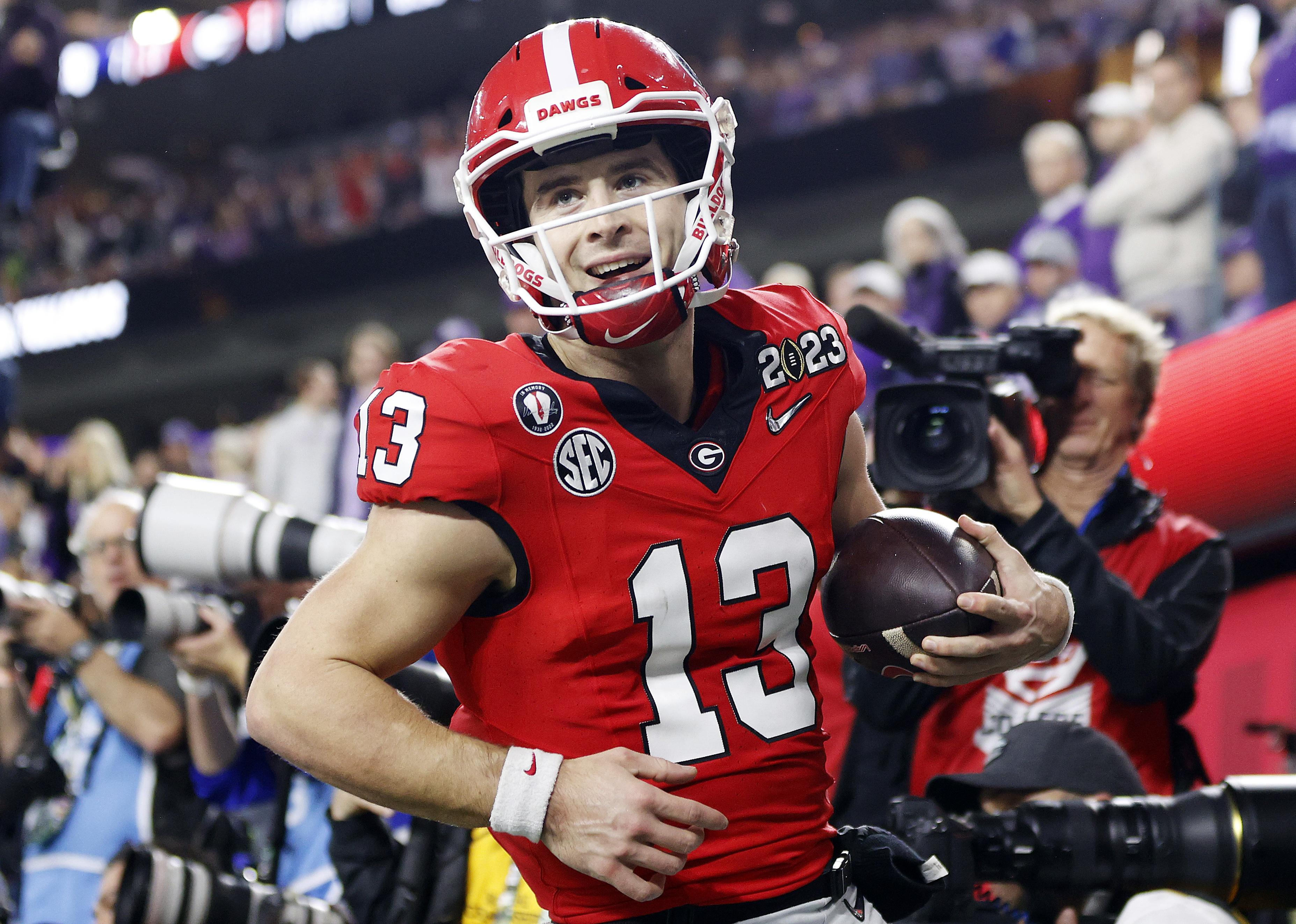 Stetson Bennett of the Georgia Bulldogs reacts after a rushing touchdown.