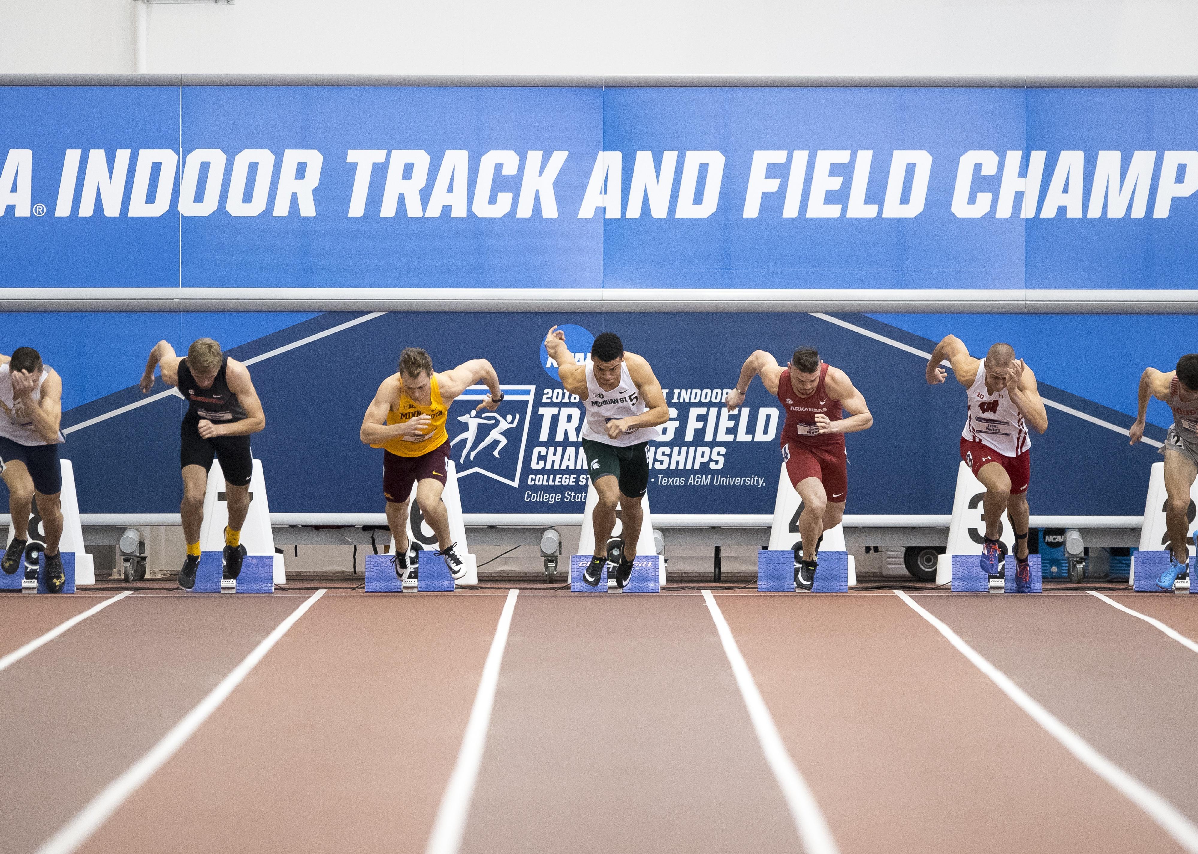 NCAA track runners starting a race.