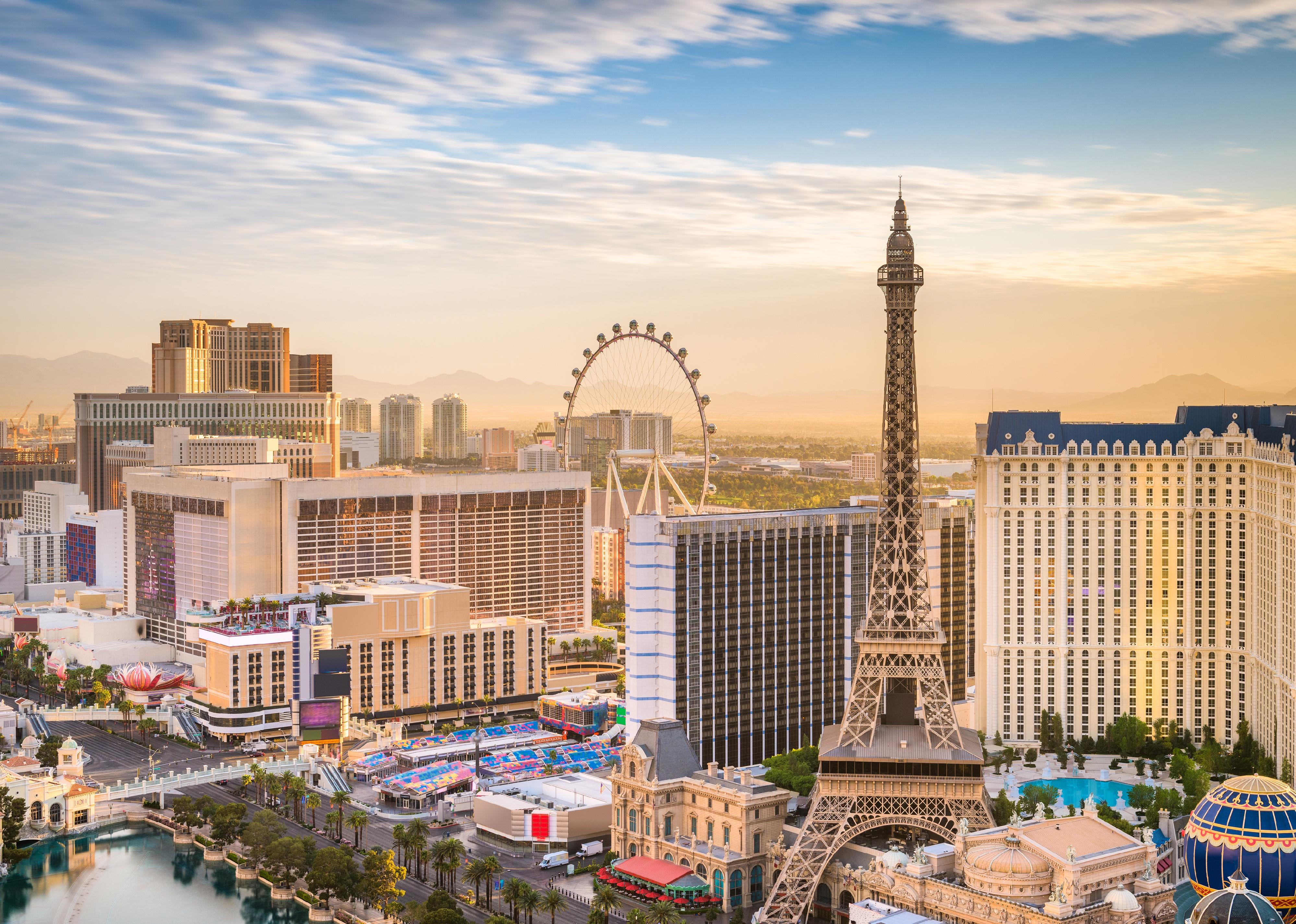 Las Vegas skyline over the strip at dusk.