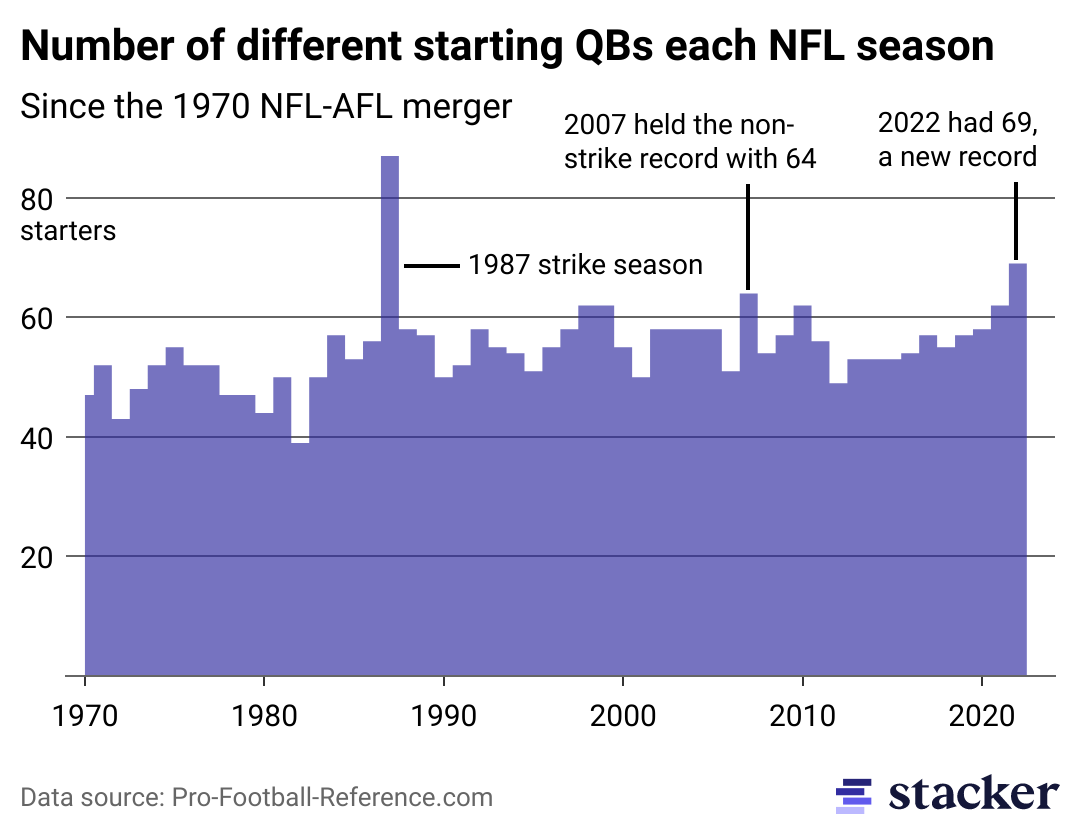 That 69 number is a non-strike year record. Previously, 2007 held the high watermark with 64 different starting signal callers (the 1987 strike season, where owners hired replacement players, still holds the all-time high of 87). The NFL eclipsed the 60-starter threshold five other times: 1998, 1999, 2010, and 2021 all had 62 different quarterbacks start at least one game; 2007 had 64 different quarterbacks starting.