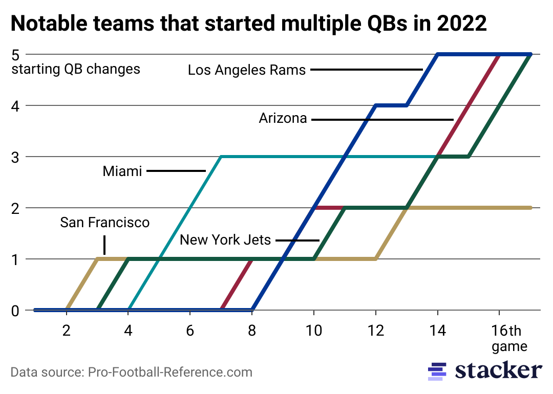 Stacker pulled statistics from Pro-Football-Reference.com to analyze the data behind the high number of different quarterbacks who started games during the 2022 NFL regular season. Read on to uncover our findings.