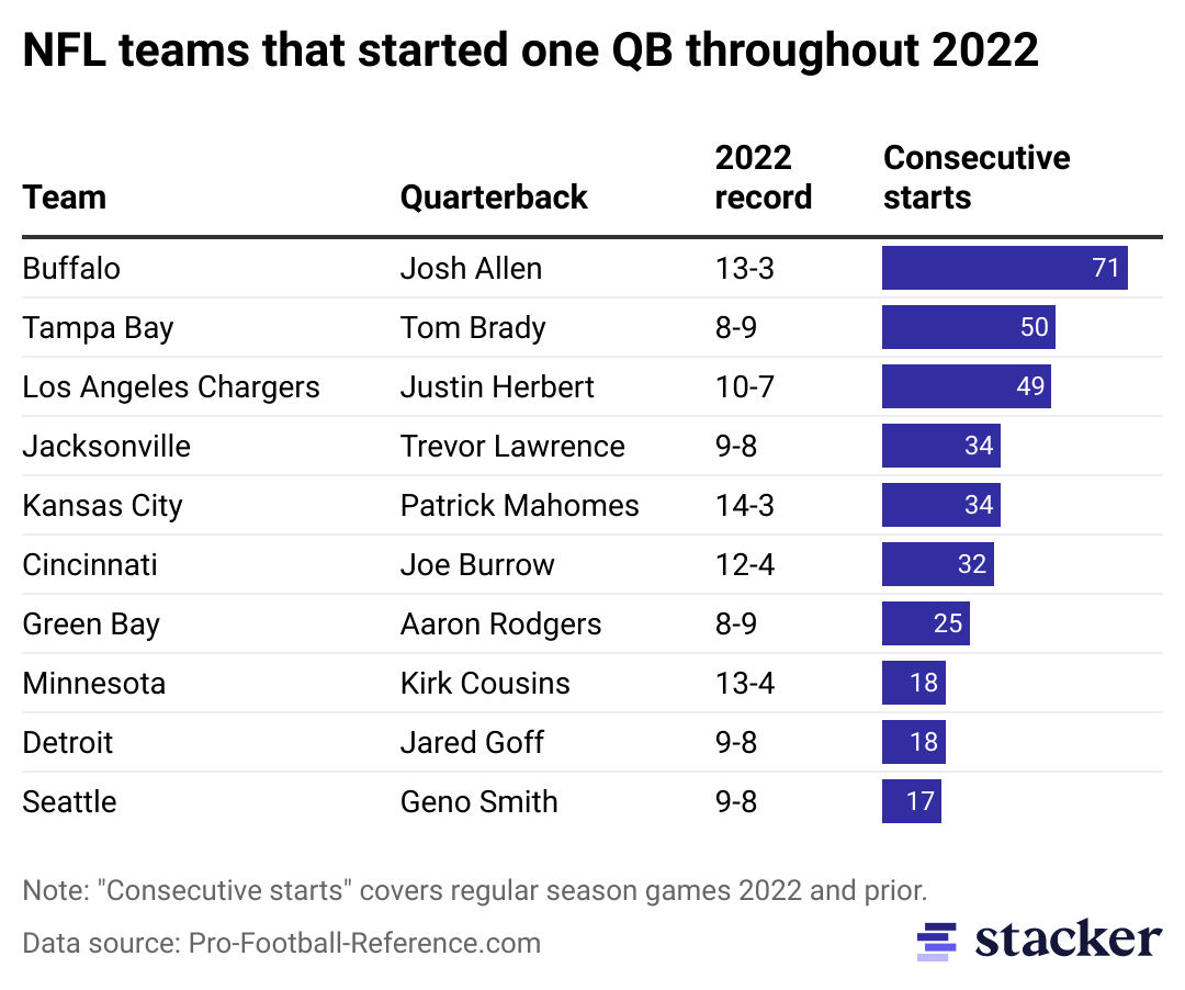 On the flip side are the teams that managed to get through 2022 with only one starter at quarterback. Unsurprisingly, these teams posted competitive records, and eight of the 10 with a single quarterback starter made the playoffs (the other two, Green Bay and Detroit, narrowly missed out on a Wild Card spot).