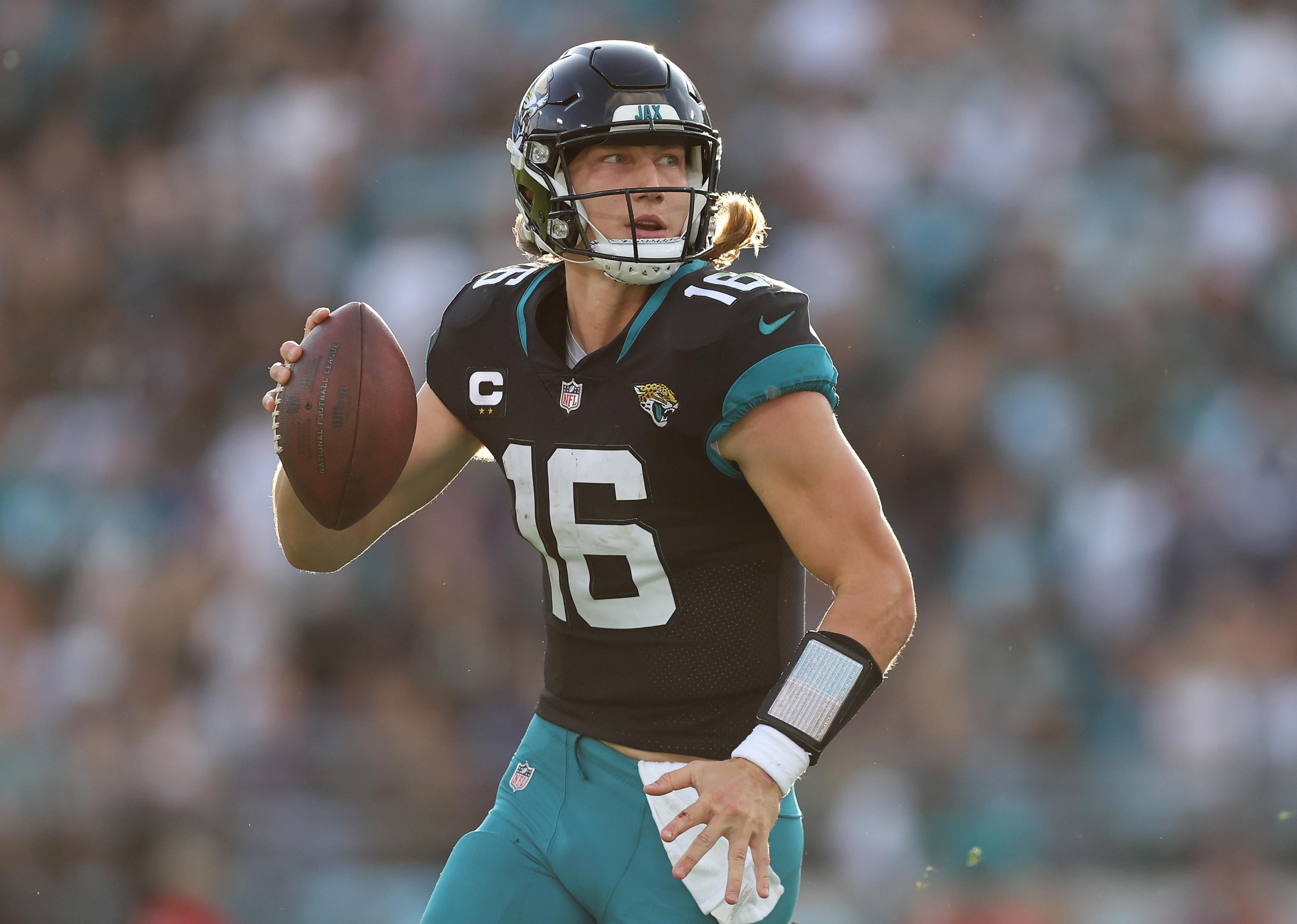 Trevor Lawrence of the Jacksonville Jaguars looks to pass during a game.