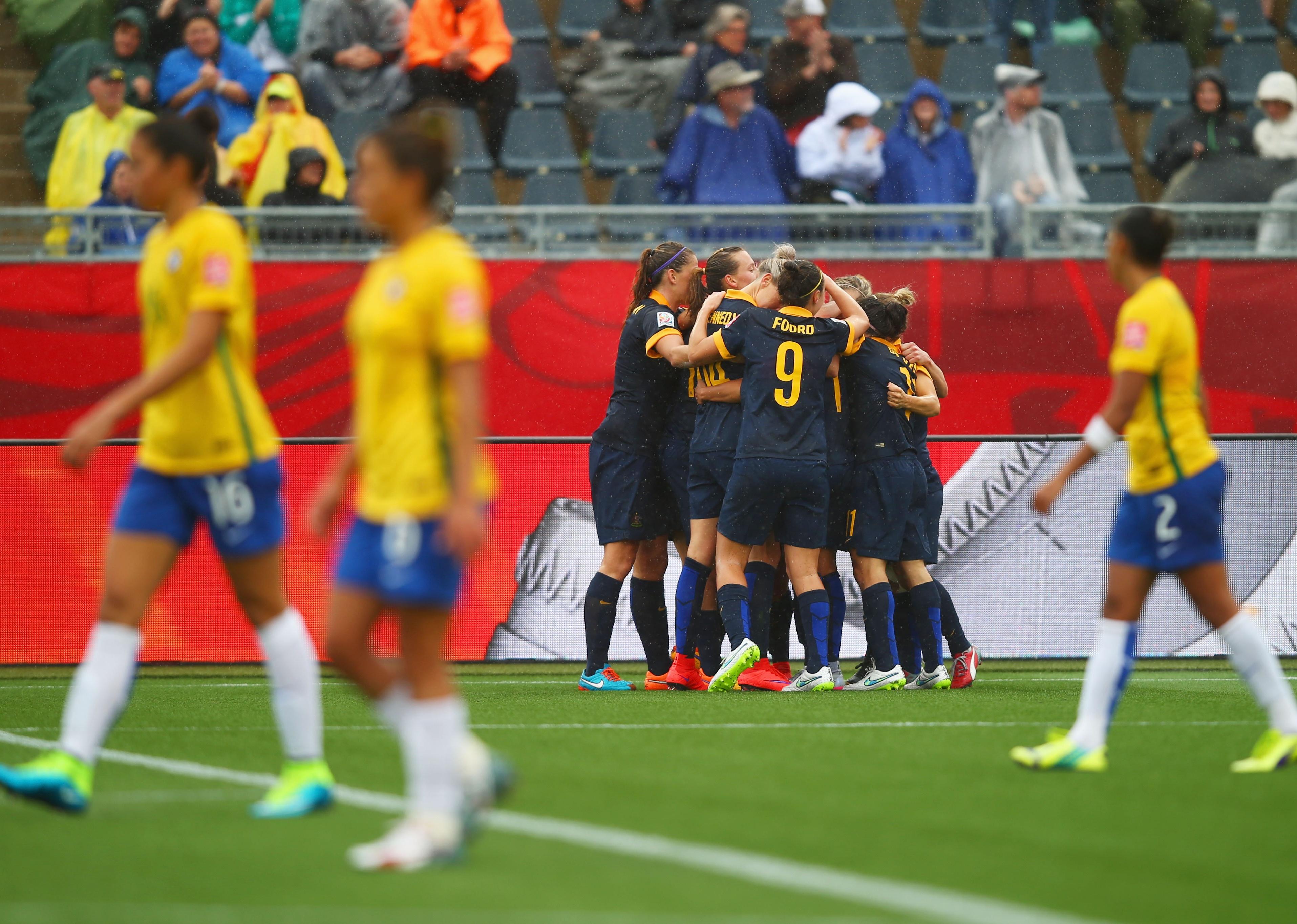 Brazil players look dejected as Kyah Simon of Australia celebrates with team after a goal.