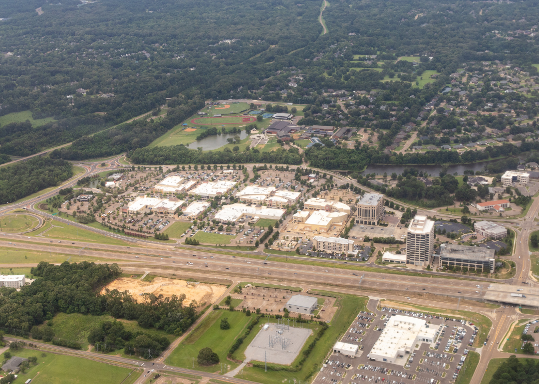An aerial view of Renaissance at Colony Park Shopping Center next to I-55 near Jackson, Mississippi.