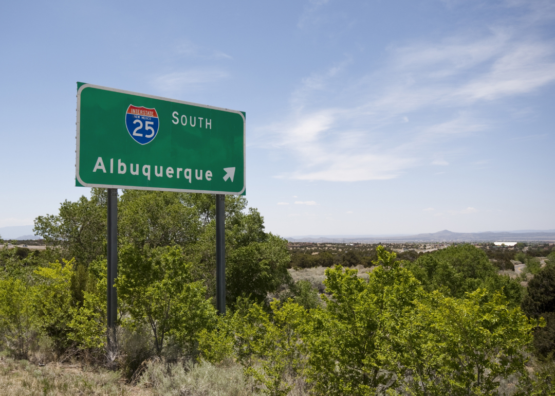 A road sign on I-25 pointing the way to Albuquerque, New Mexico.