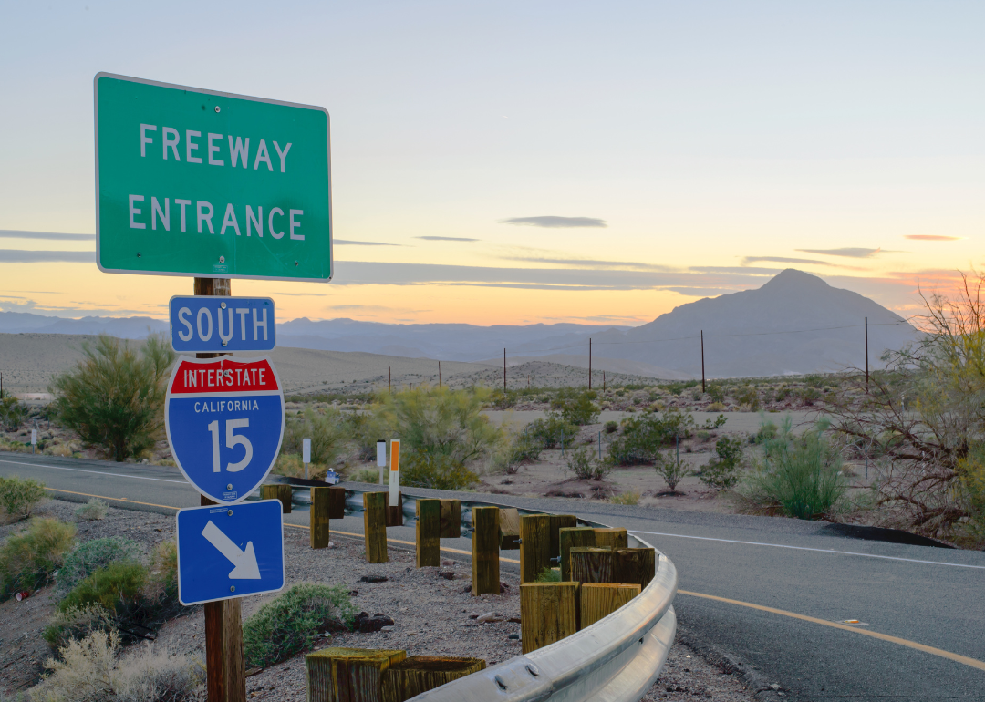 A colorful western sunset at a freeway entrance to Interstate 15 in Death Valley, California.
