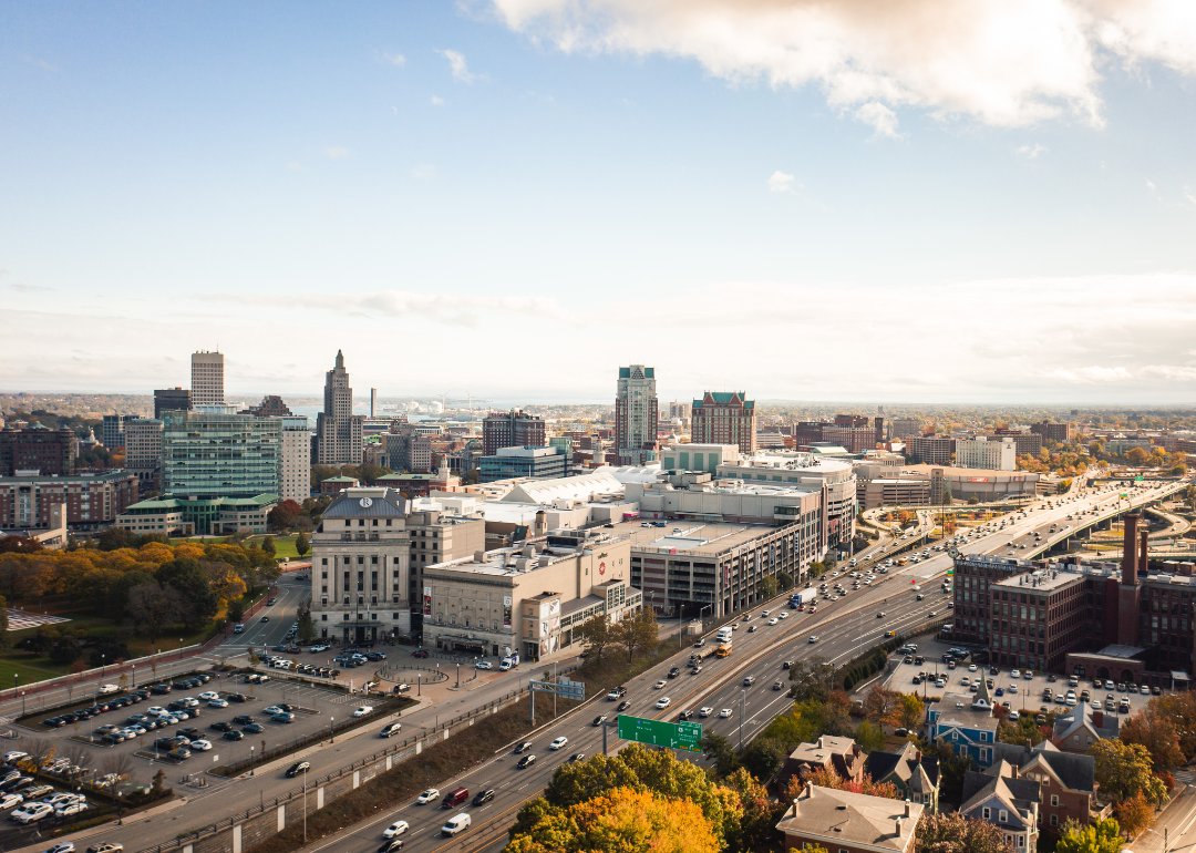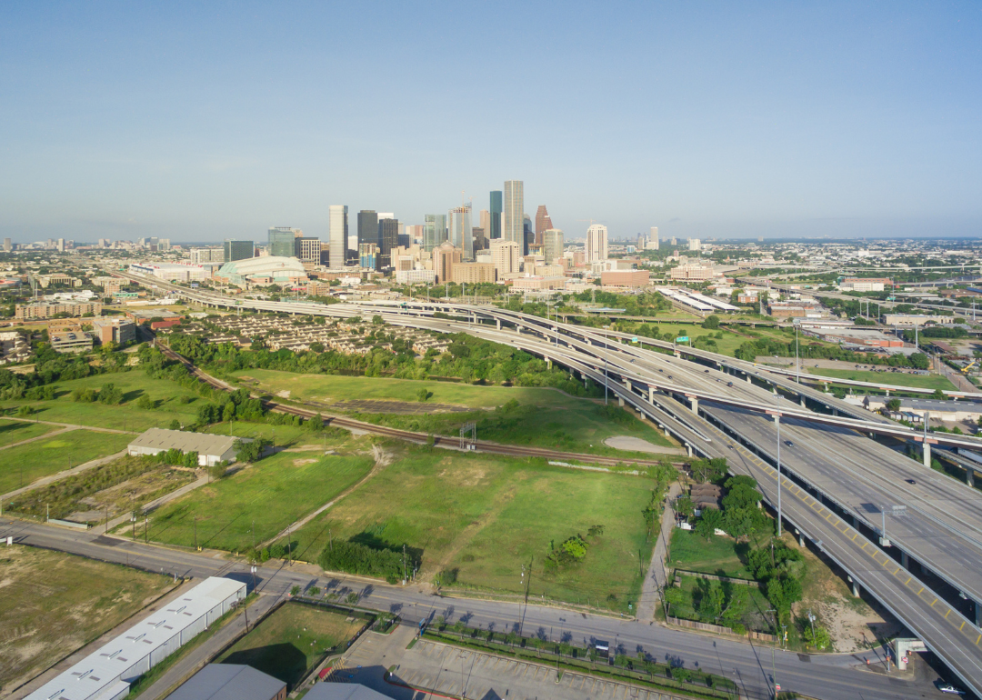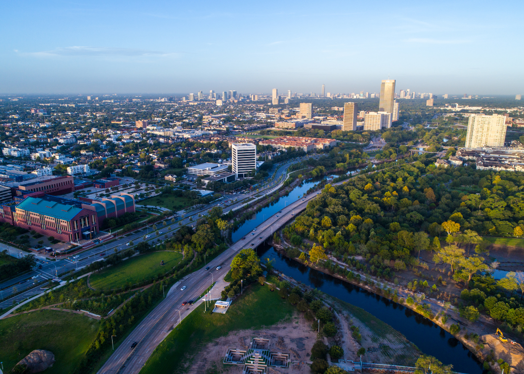 An aerial drone view of Houston looking down on the Buffalo River and Interstate 20.