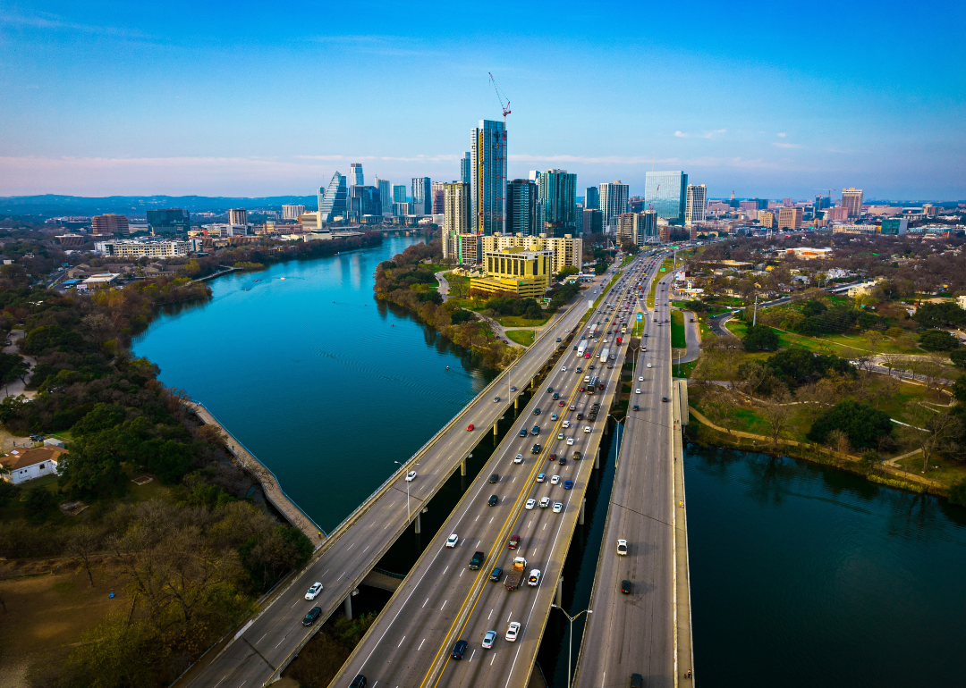 An aerial drone view of the Colorado River and Interstate 35 leading into Austin, Texas.