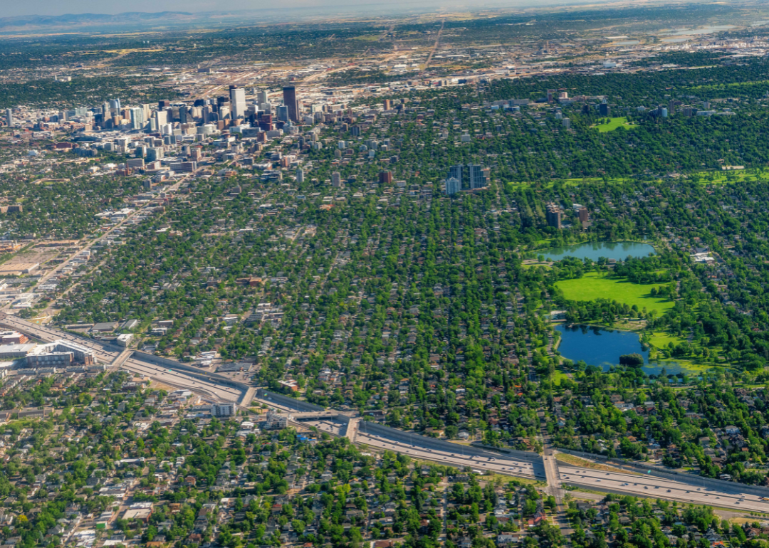 Interstate 70 passing by Denver, Colorado, as seen from above.