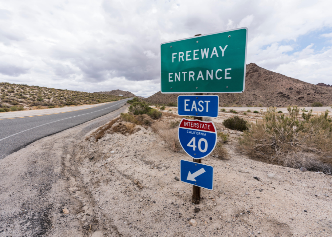 Interstate 40 east freeway on ramp sign near Mojave National Preserve in Southern California.