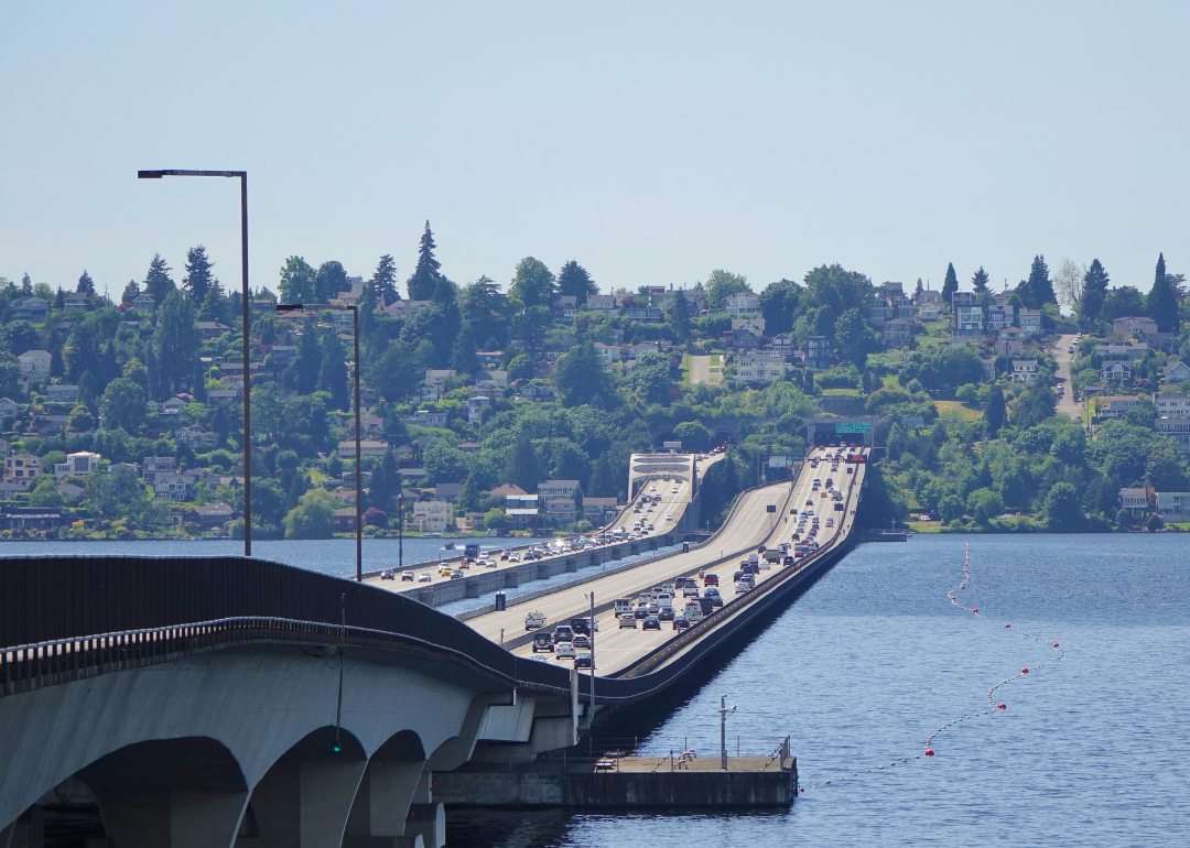 Looking west at the Interstate 90 floating bridge across Lake Washington in Seattle.