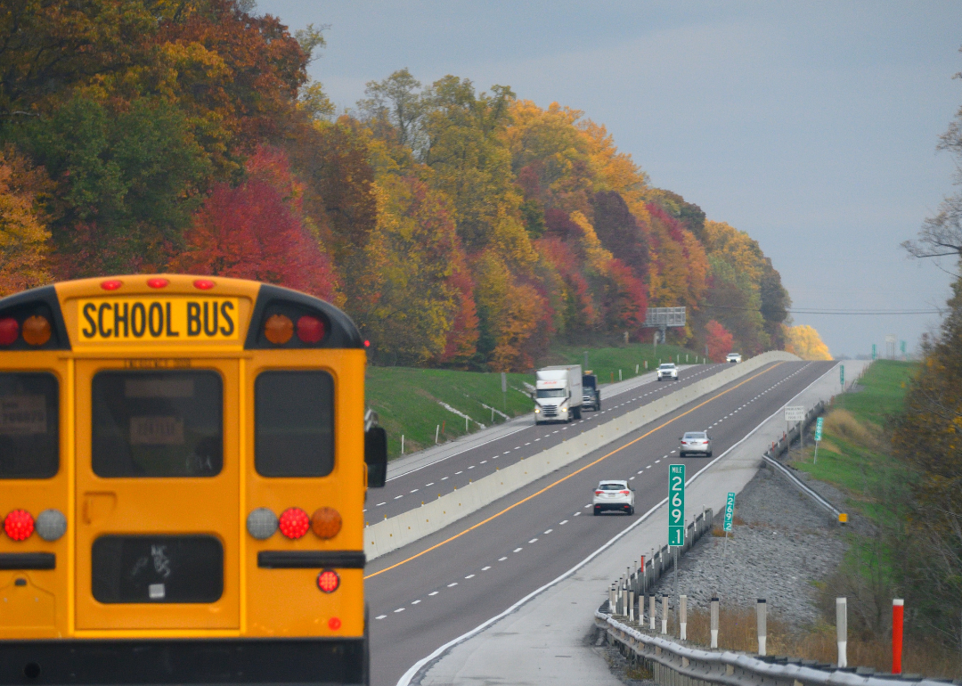 Tree foliage in peak fall colors lining the Pennsylvania turnpike on I-76.