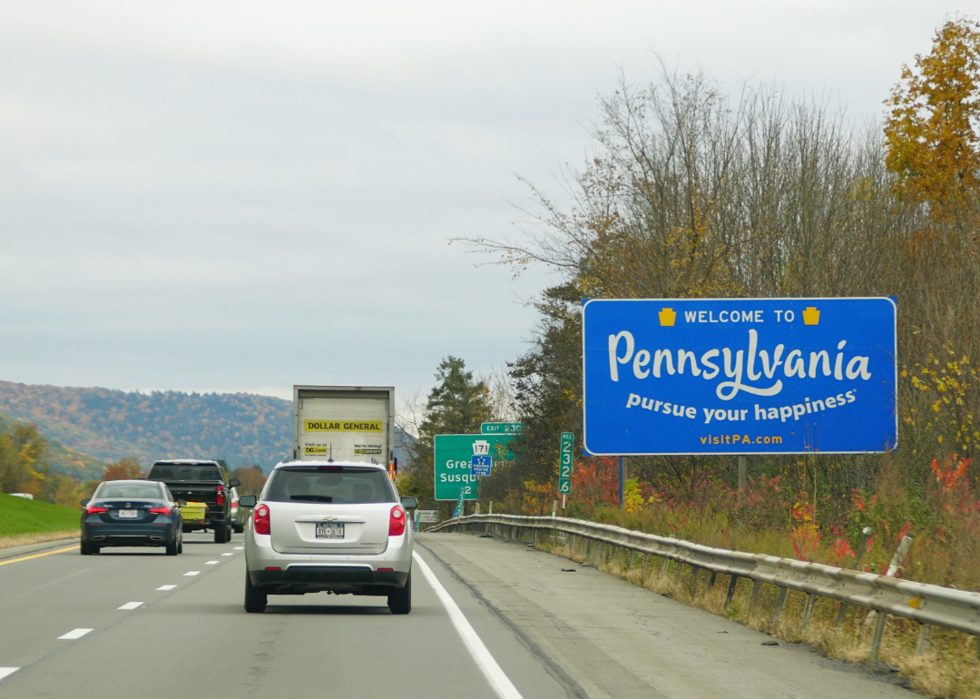 Interstate 81 and the welcome sign at the border into Pennsylvania.