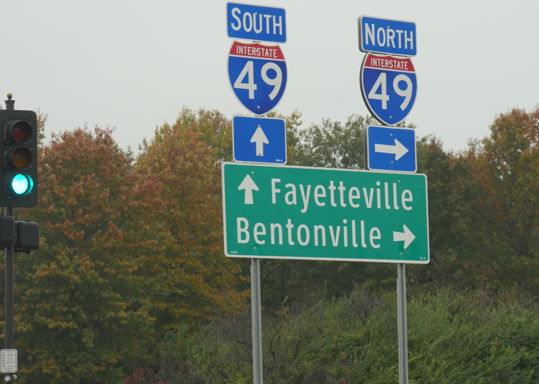 Roadside signs and directions to Fayetteville and Bentonville along Interstate 49 in Arkansas.